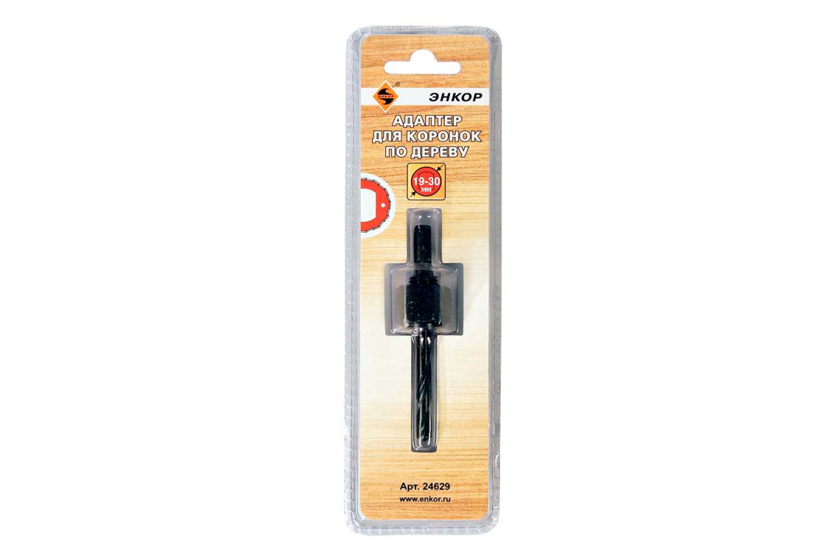 Адаптер Энкор 24629 используется совместно с коронками по дереву диаметром от 19 до 30 мм. С помощью приспособления коронка надежно фиксируется в патроне дрели. Адаптер имеет шестигранный хвостовик 1/4".