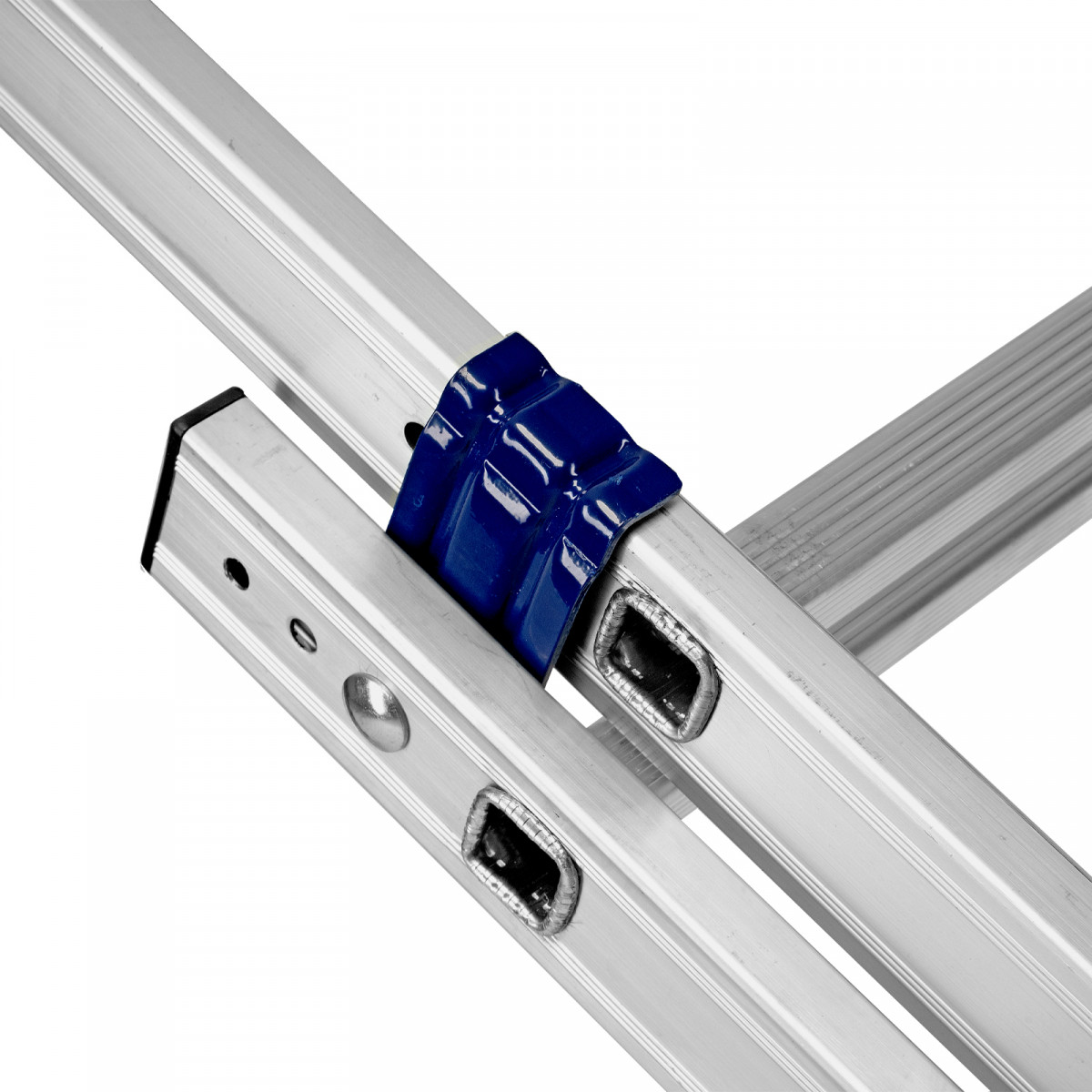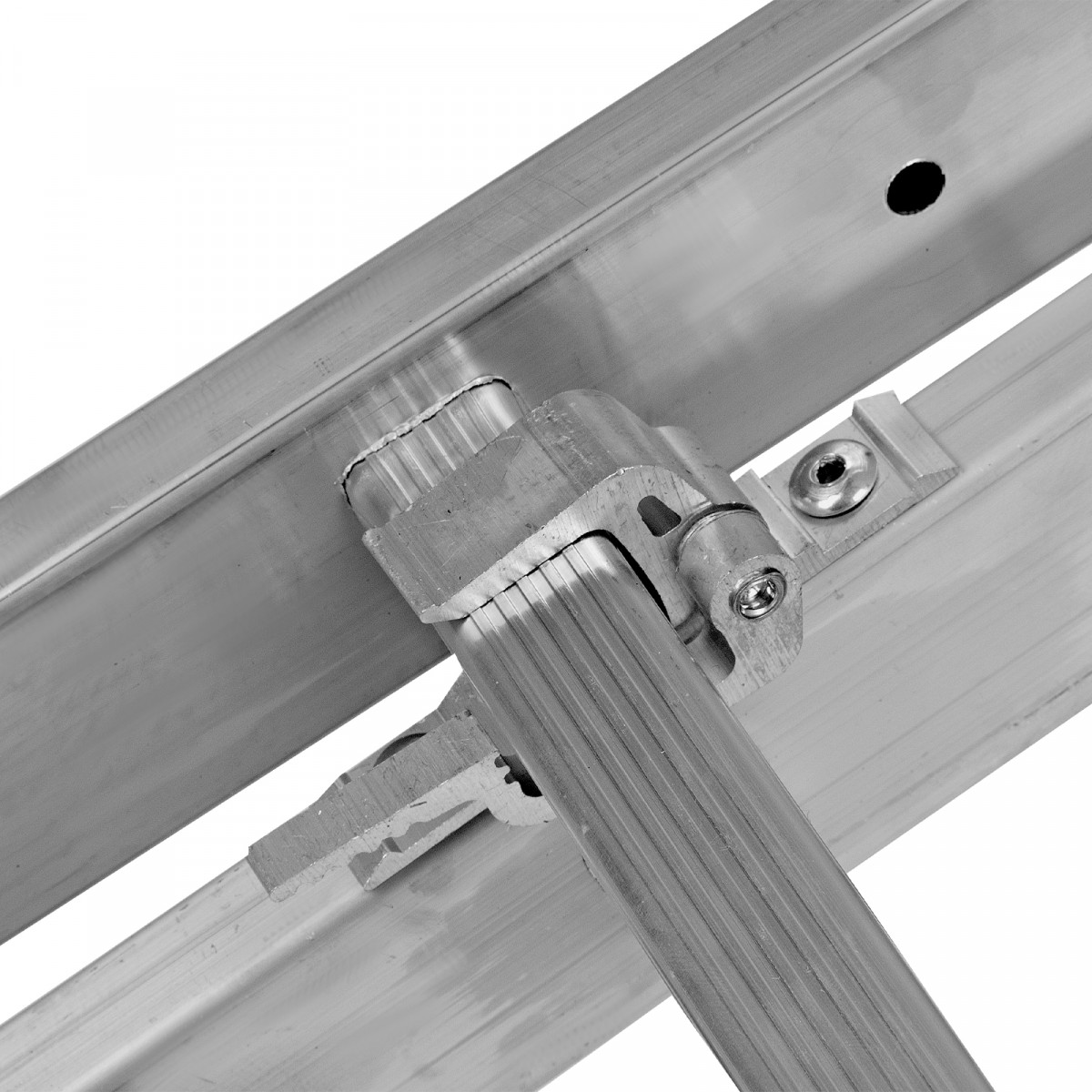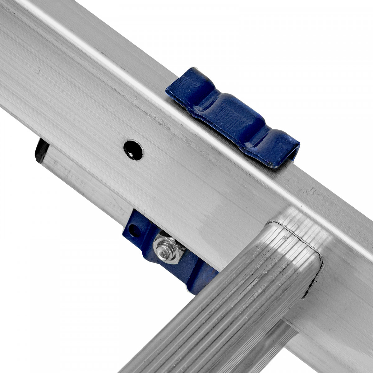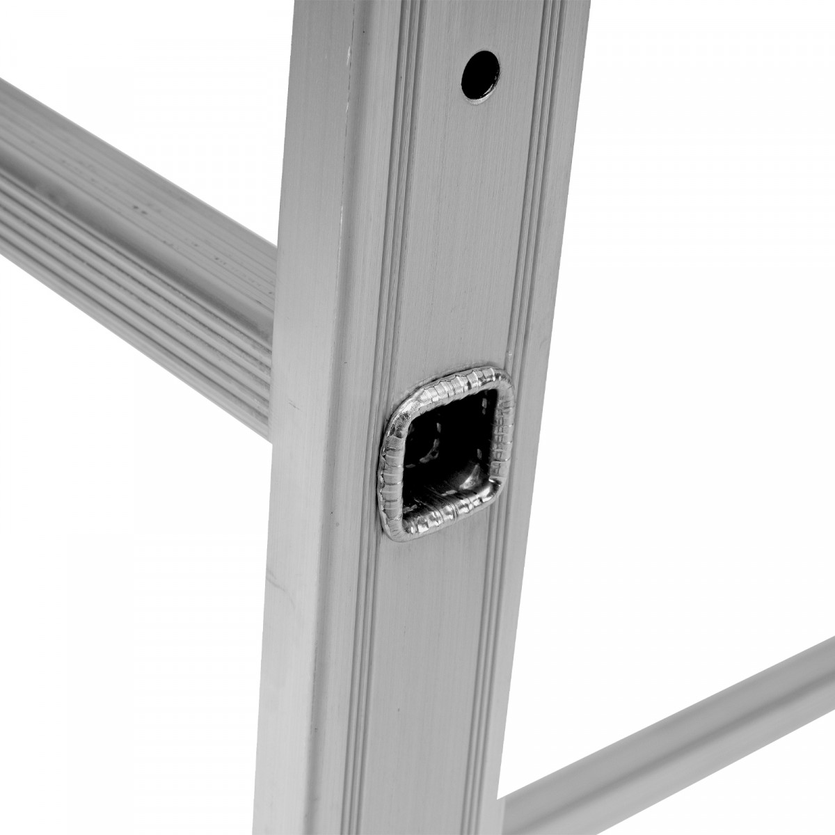 - Надежная конструкция — ступеньки прочно соединены с опорами за счет многократной развальцовки, выдвижная секция крепко удерживается алюминиевыми кронштейнами.