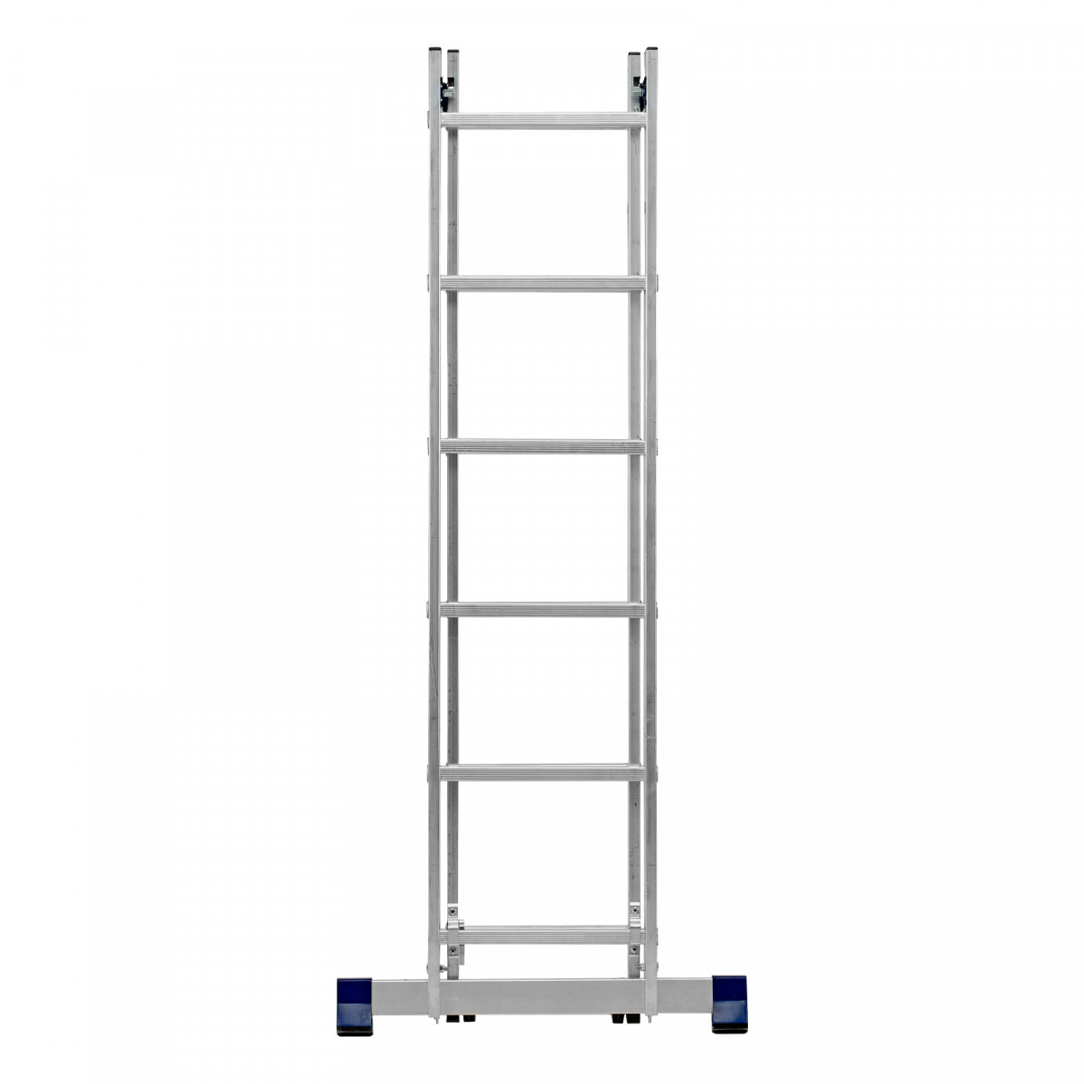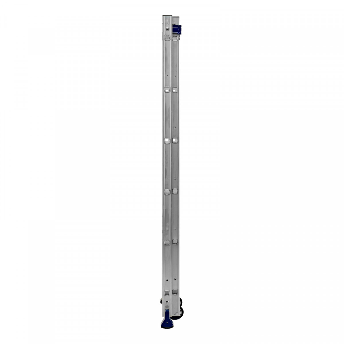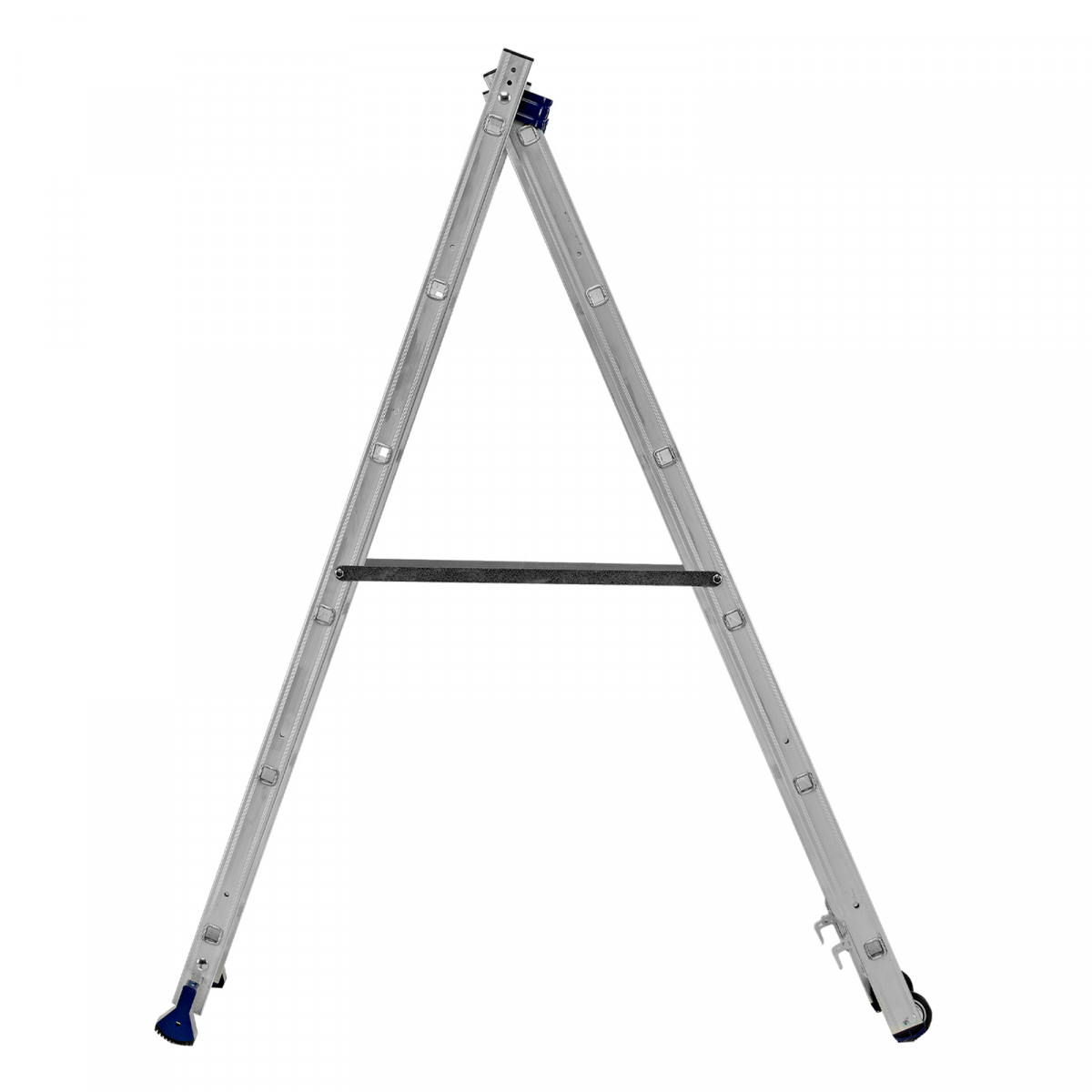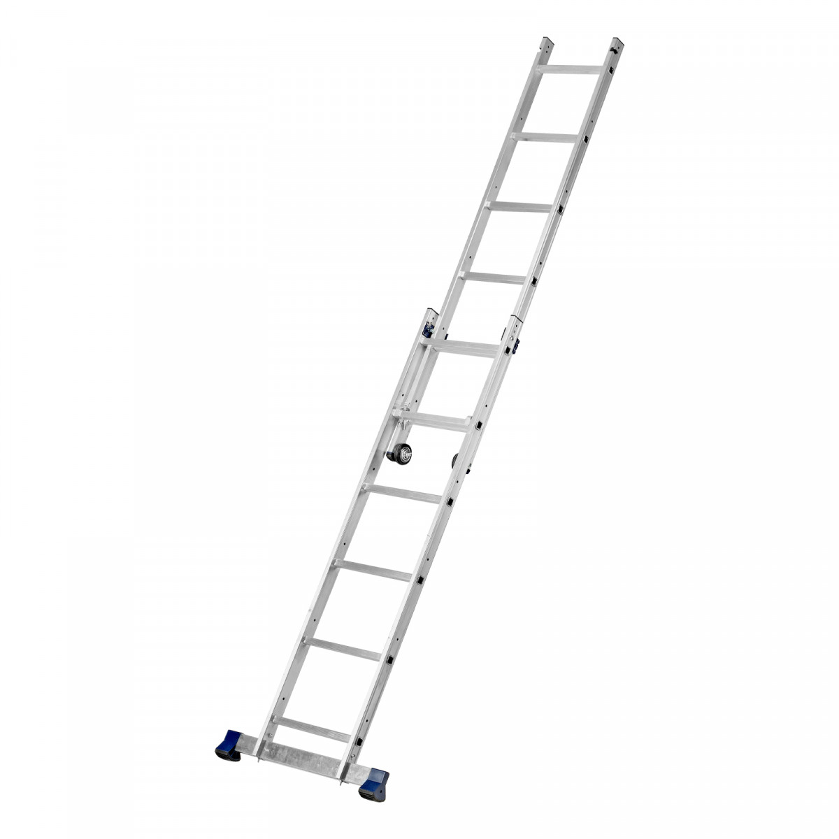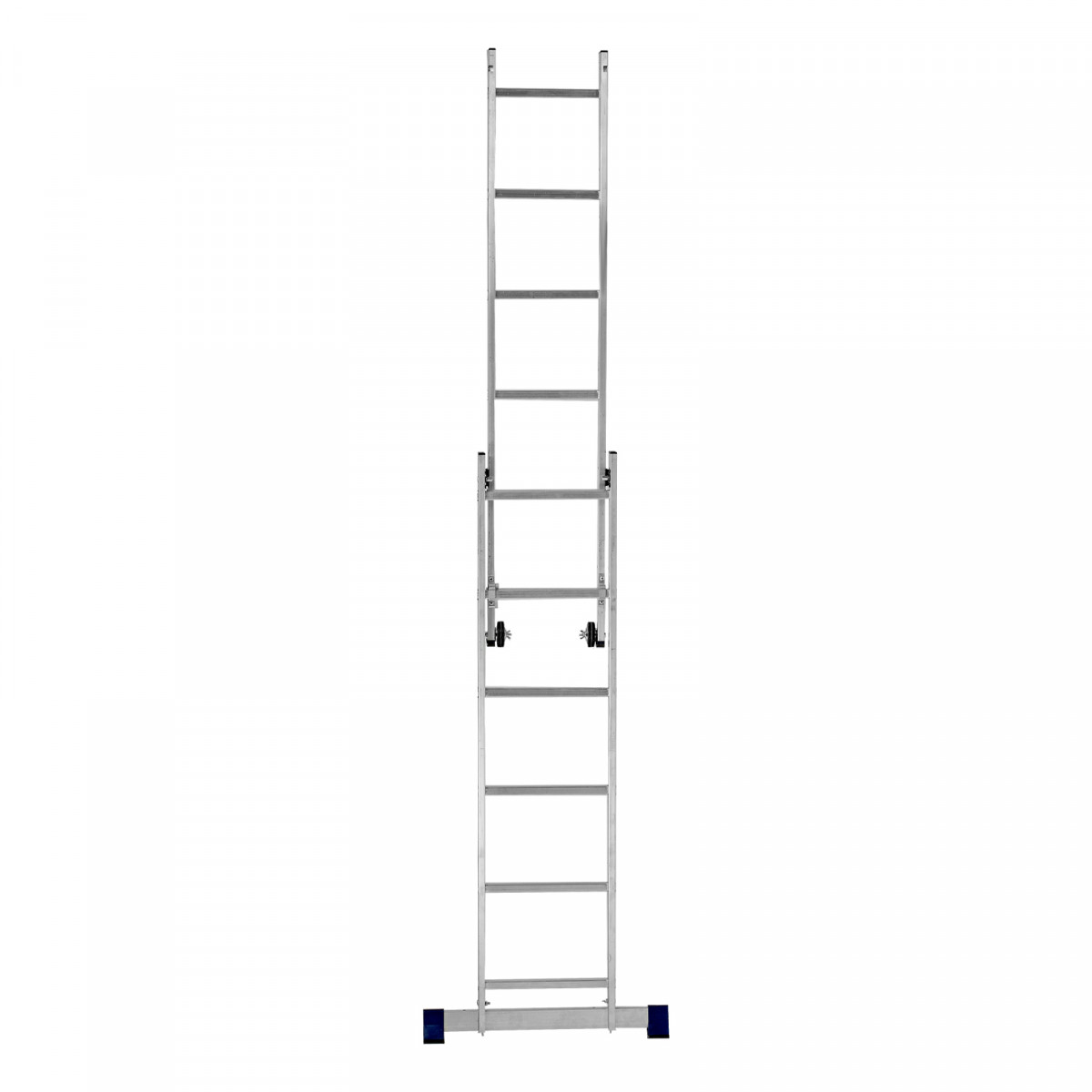 - Надежная конструкция — ступеньки прочно соединены с опорами за счет многократной развальцовки, выдвижная секция крепко удерживается алюминиевыми кронштейнами.