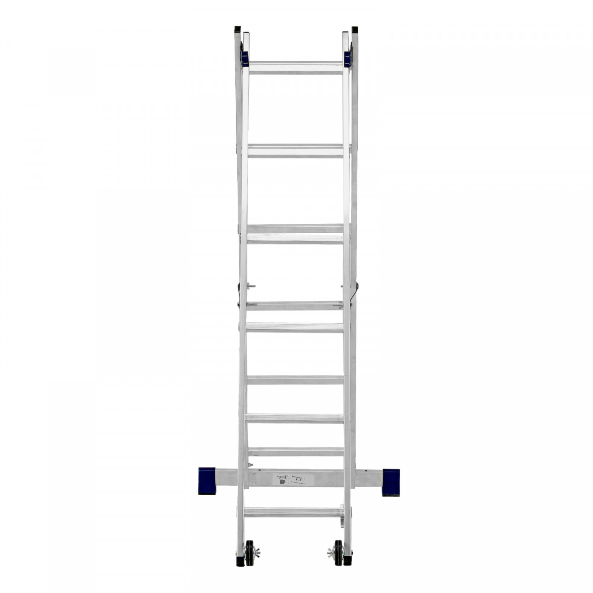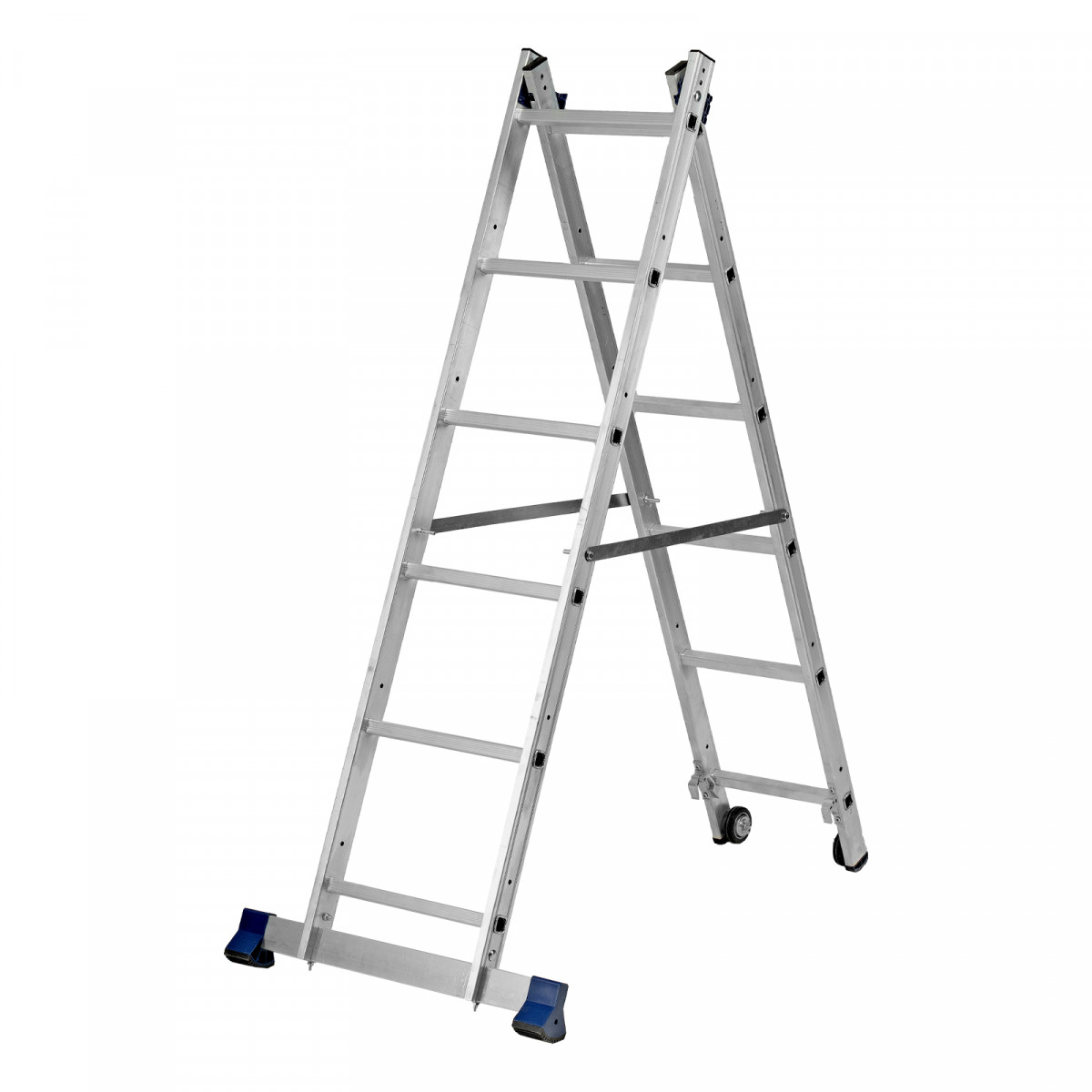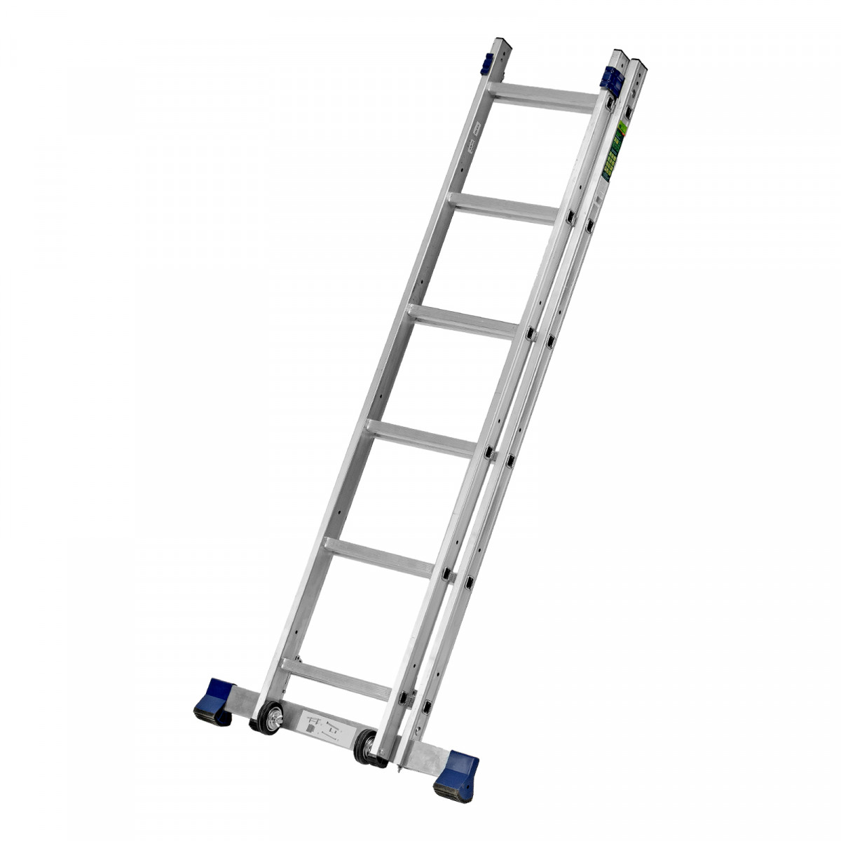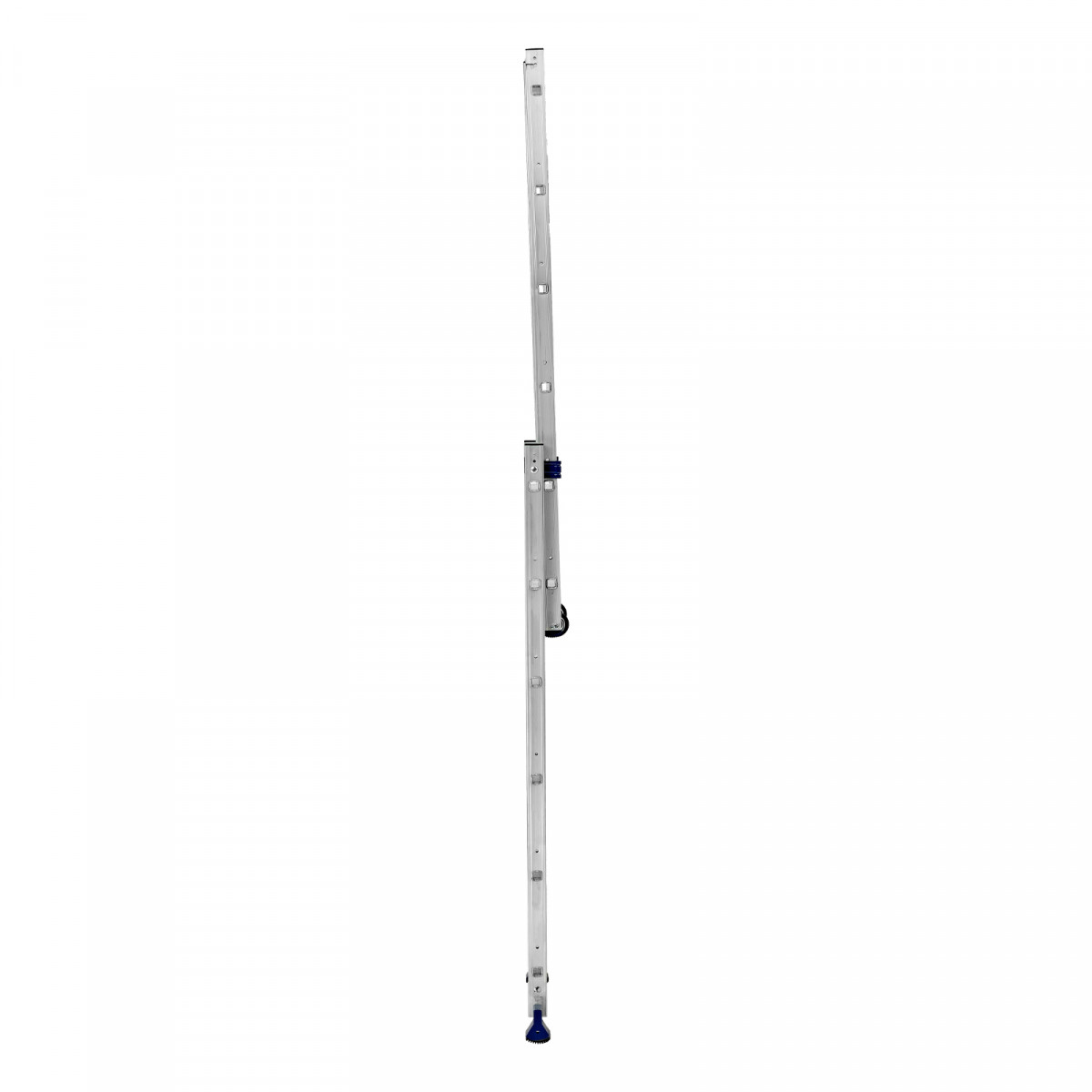 - Надежная конструкция — ступеньки прочно соединены с опорами за счет многократной развальцовки, выдвижная секция крепко удерживается алюминиевыми кронштейнами.