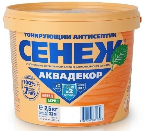 Тонирующий антисептик на алкидно-акрилатной основе с УФ фильтром и воском для долговременной защиты и отделки древесины от атмосферных осадков, плесневых, деревоокрашивающих и дереворазрушающих грибов, водорослей и насекомых-древоточцев, а также декоративной отделки под ценные породы. Сочетание в СЕНЕЖ АКВАДЕКОР алкидов, акрилатов и льняного масла улучшает проникновение в древесину, формирует эластичное дышащее защитное покрытие с мягким шелковистым блеском. Расход для однослойного нанесения для пиленой поверхности – 120-180 г/м2 (5-8 м2/кг), для строганной поверхности – 70-90 г/м2 (11-14 м2/кг). Расход зависит от древесины.