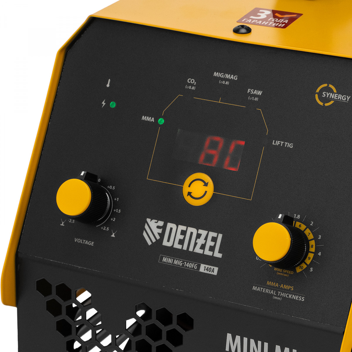 - Синергетическое управление — в режимах MIG и FCAW происходит автоматическая корректировка скорости подачи проволоки и напряжения сварочной дуги.
