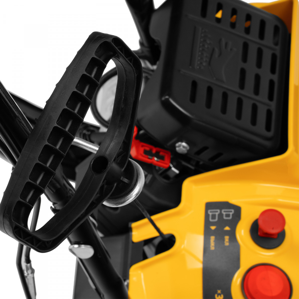 • Эргономичность — широкая рукоятка ручного старта облегчает запуск двигателя, для регулировки угла поворота желоба не нужно наклоняться.