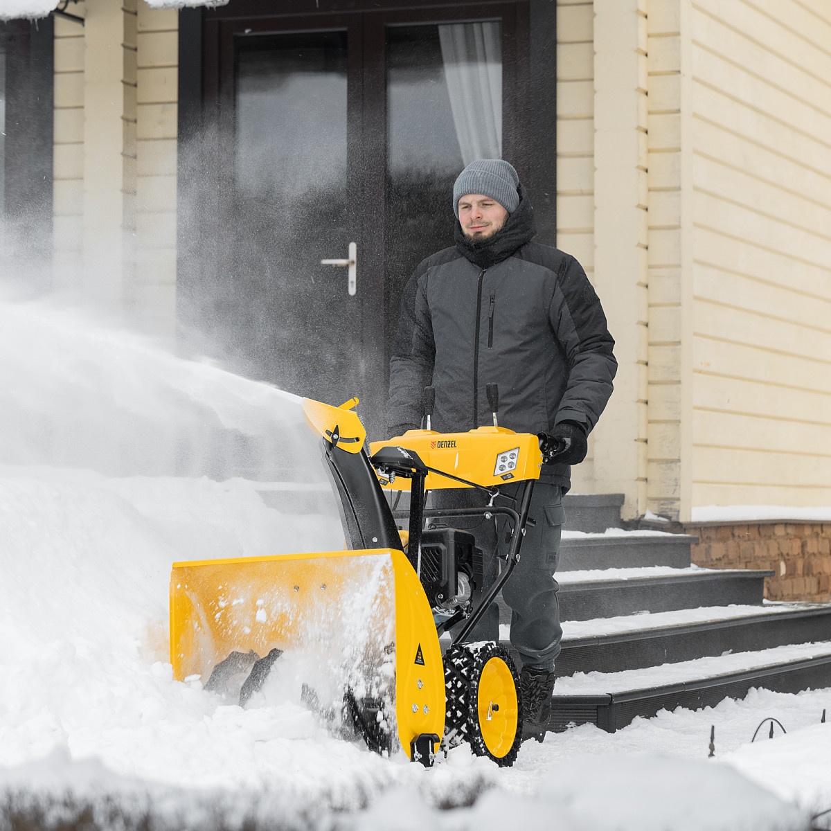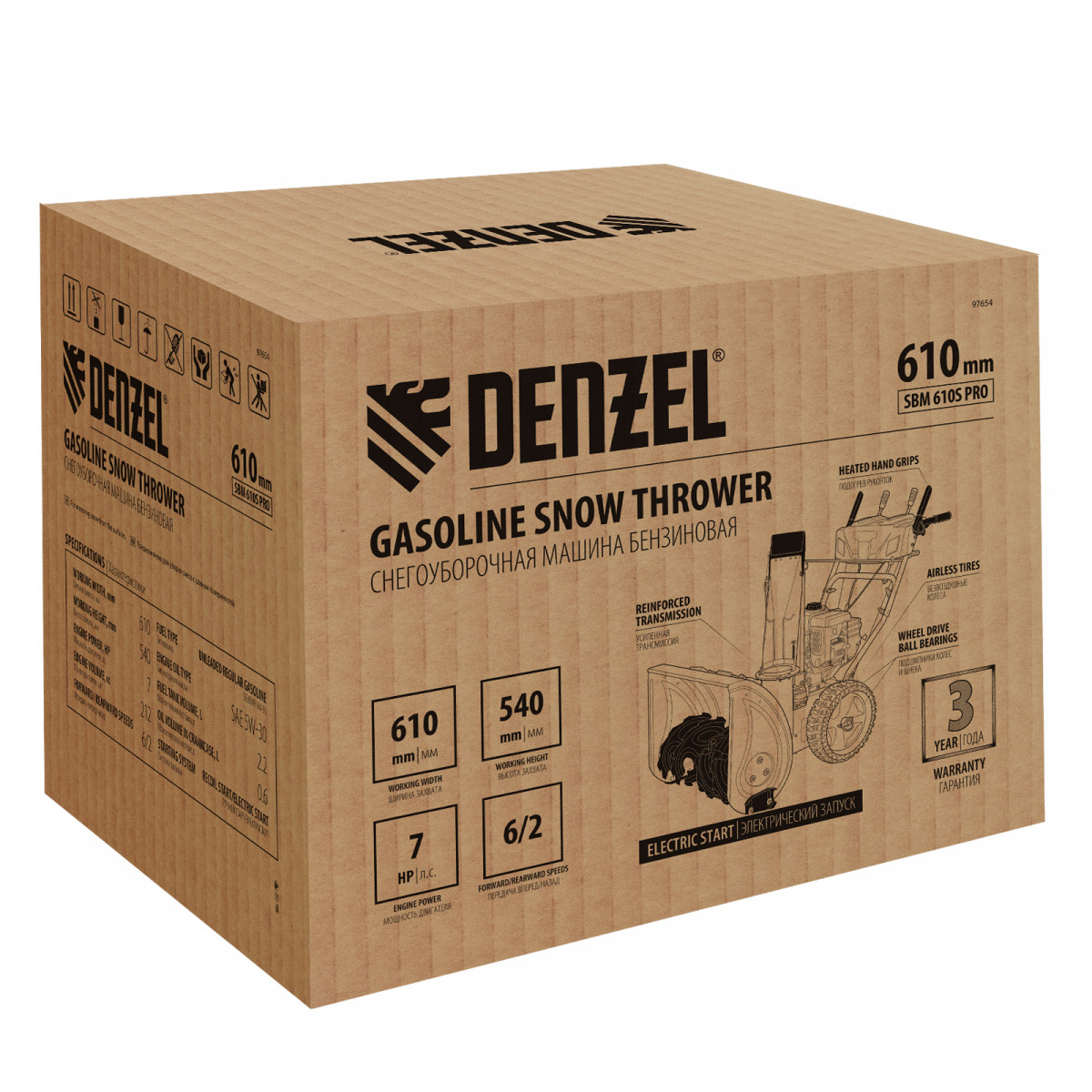 Бензиновая снегоуборочная машина Denzel SBM 610S PRO 97654 с двигателем объемом 212 cм3, электростартером, фарой и обогревом рукояток предназначена для уборки территорий загородных домов, коттеджей, подъездных дорог и улиц СНТ, парковок и городских дворовых территорий.,Ресурсный зимний двигатель с увеличенным крутящим моментом и шнек с агрессивным профилем ледорубов обеспечивают эффективную уборку даже плотного слежавшегося снега с наледью. Ковш шириной захвата 710 мм (с учетом подрезателей Denzel 97102) и высотой захвата 540 мм эффективно справляется с большими сугробами. Denzel SBM 610S PRO — профессиональный выбор для коммунальных служб, организаций, а также людей, ценящих комфорт, функционал и эстетический внешний вид.