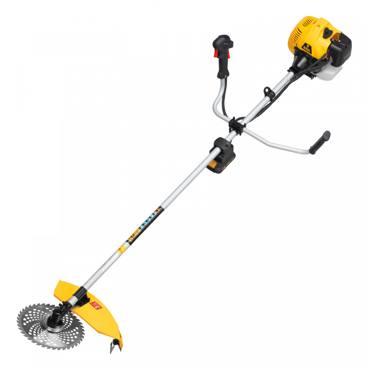 Бензиновый триммер Denzel DT-43E 962015 с двигателем объемом 43 куб. см, с неразъемной штангой и электростартером, поставляется комплектом из 2 частей и используется для ухода за дачным участком. С его помощью можно подравнять газон, скосить траву любого типа, в том числе с жесткими древовидными стеблями (полынь, крапива, лебеда, борщевик), а также срезать кустарник и молодые побеги деревьев с диаметром стволов до 10 мм. Триммер успешно справляется с этими задачами благодаря входящим в комплект катушке с леской и пильному диску с шириной скашивания 42 и 25,5 см соответственно. На штангу уже установлен редуктор и корпус сцепления, что упрощает подготовку инструмента к работе.