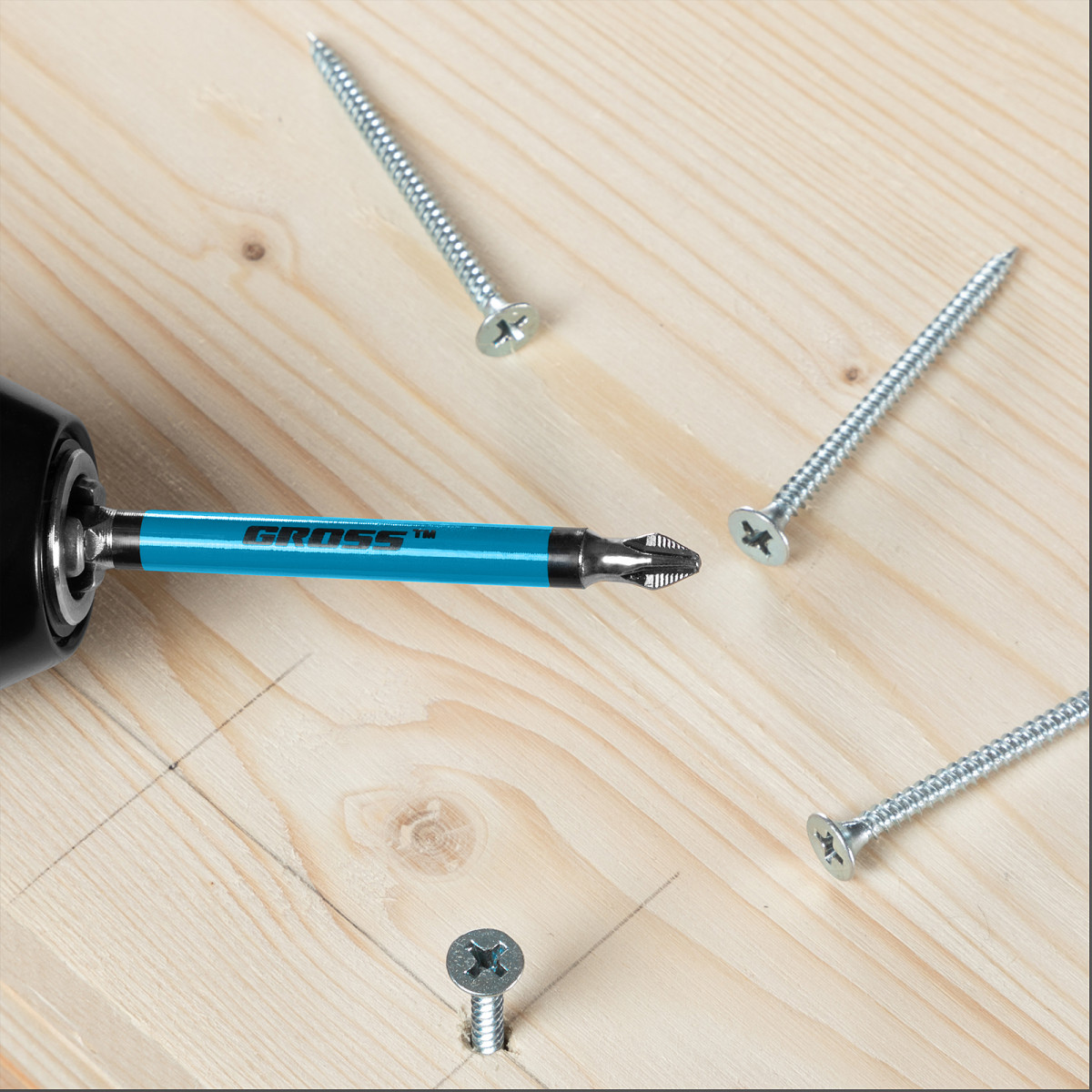 - Долговечность — насечки на шлице препятствуют проскальзыванию и «слизыванию» бит, дополнительно усиливают контроль при работе с саморезами по дереву.