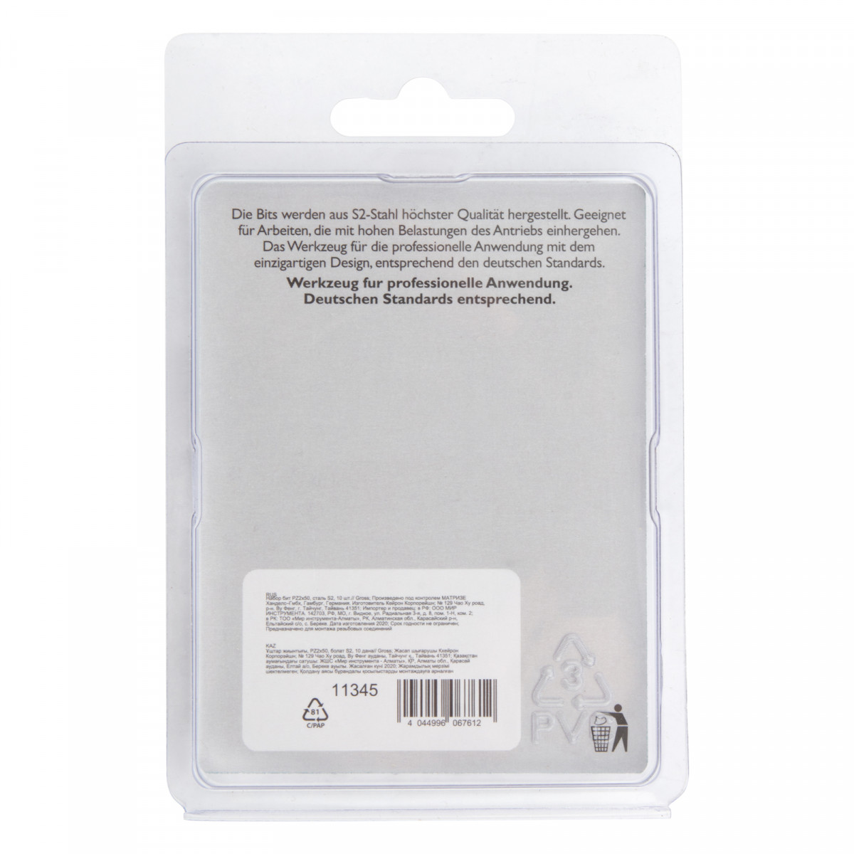 Набор бит Gross 11345 состоит из 10 насадок типоразмера PZ2 и длиной 50 мм, с хвостовиком 1/4 дюйма, изготовленных из стали S2 и предназначенных для шуруповертов. Оснастки служат для монтажа и демонтажа шурупов, саморезов и других резьбовых соединений. Шлиц PZ имеет 4 дополнительных ребра, благодаря чему предотвращается проскальзывание биты в крепеже, повышаются точность и эффективность работ.