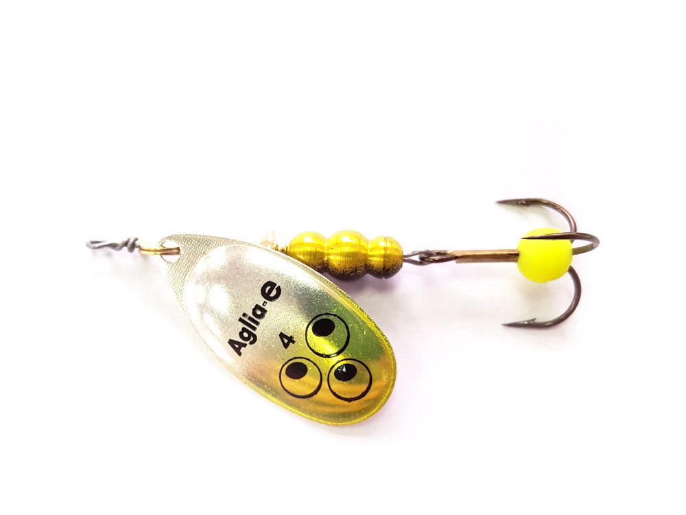 AGLIA TW — отличаются от базовой модели AGLIA двухцветной рефлекторной окраской лепестка и возможностью быстрой замены тройника. Грузик сердечника у AGLIA TW имеет внутреннюю резьбу с очень крупным шагом. Проволочная ось завершается колечком для крючка, сопряженным с пружинной шпилькой. Находясь в теле груза, пружинная шпилька упирается в уступ крупной резьбы. В данном случае шестигранный грузик служит винтовым замочком. Освобождение шпильки осуществляется простым свинчиванием груза, а возвратная фиксация — вдавливанием шпильки в его тело. Это простой, но очень надежный узел крепления (не разрушается даже при значительных нагрузках). AGLIA TW — настоящий клад для любителей экспериментов на водоемах. Рыболов получает возможность быстро укомплектовать вращалку пластиковой рыбкой, виброхвостом, твистером или просто тройником с мухой подходящего цвета.