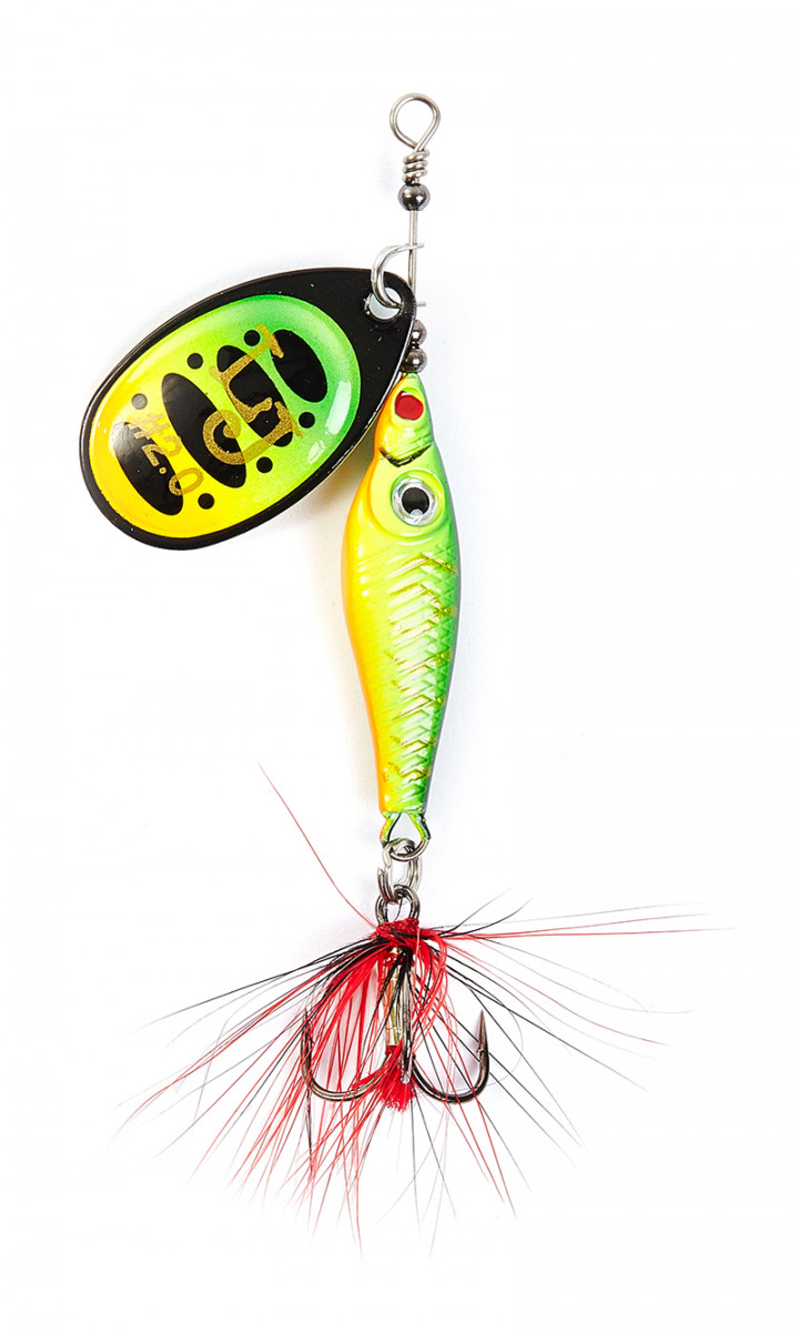 На всех тройниках связана яркая мушка, которая служит дополнительным раздражителем для рыбы и обеспечивает ровное вращение лепестка при самой медленной проводке.