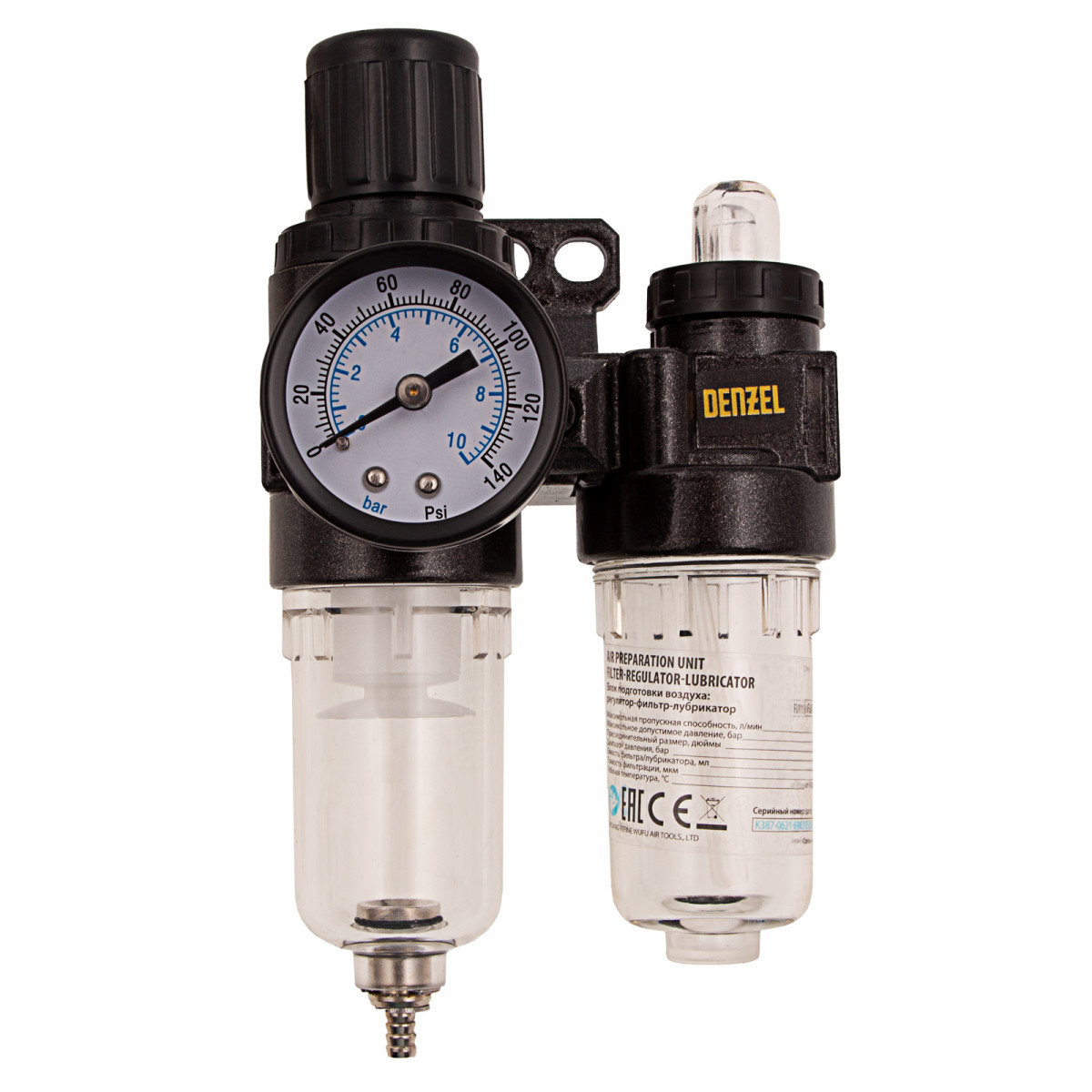 Блок подготовки воздуха Denzel FLR1500 57469 с фильтром-влагоотделителем, регулятором и лубрикатором, с присоединительным размером 1/4 дюйма, имеет пропускную способность 1500 л/мин, работает под давлением до 10 бар и позволяет увеличить срок службы пневматического инструмента.,Регулятор со встроенным манометром помогает контролировать и поддерживать заданное давление для корректной работы пневмоинструмента. Фильтр предназначен для очистки сжатого воздуха от конденсата и посторонних частиц размером от 40 мкм. Лубрикатор служит для подачи масла к пневмоинструменту. Блок используется совместно с компрессорами на строительной площадке, в мастерской, на производстве, в автосервисе, пригодится также в гараже.