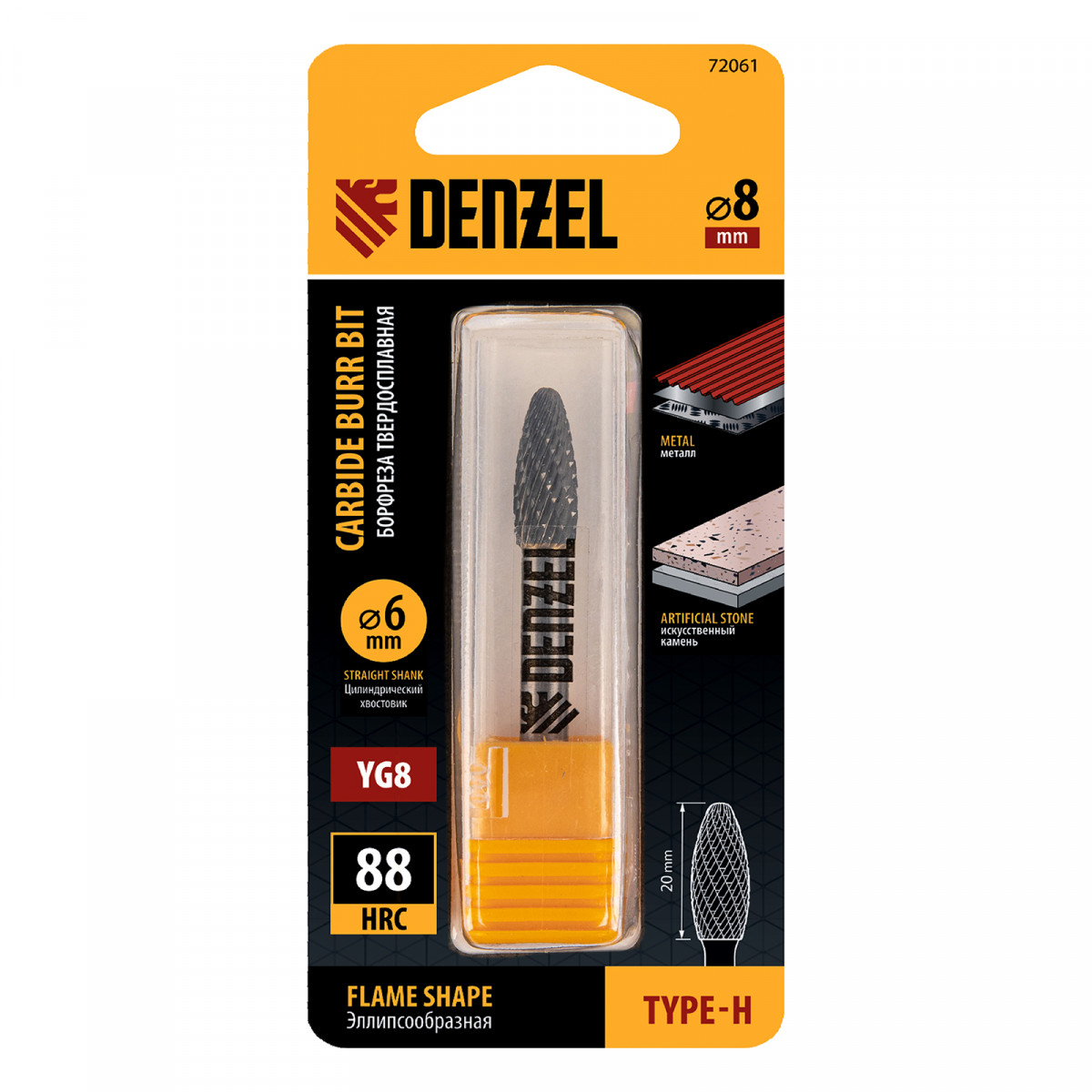 Борфреза по металлу твердосплавная, элипсообразная, тип-H, 8 мм Denzel