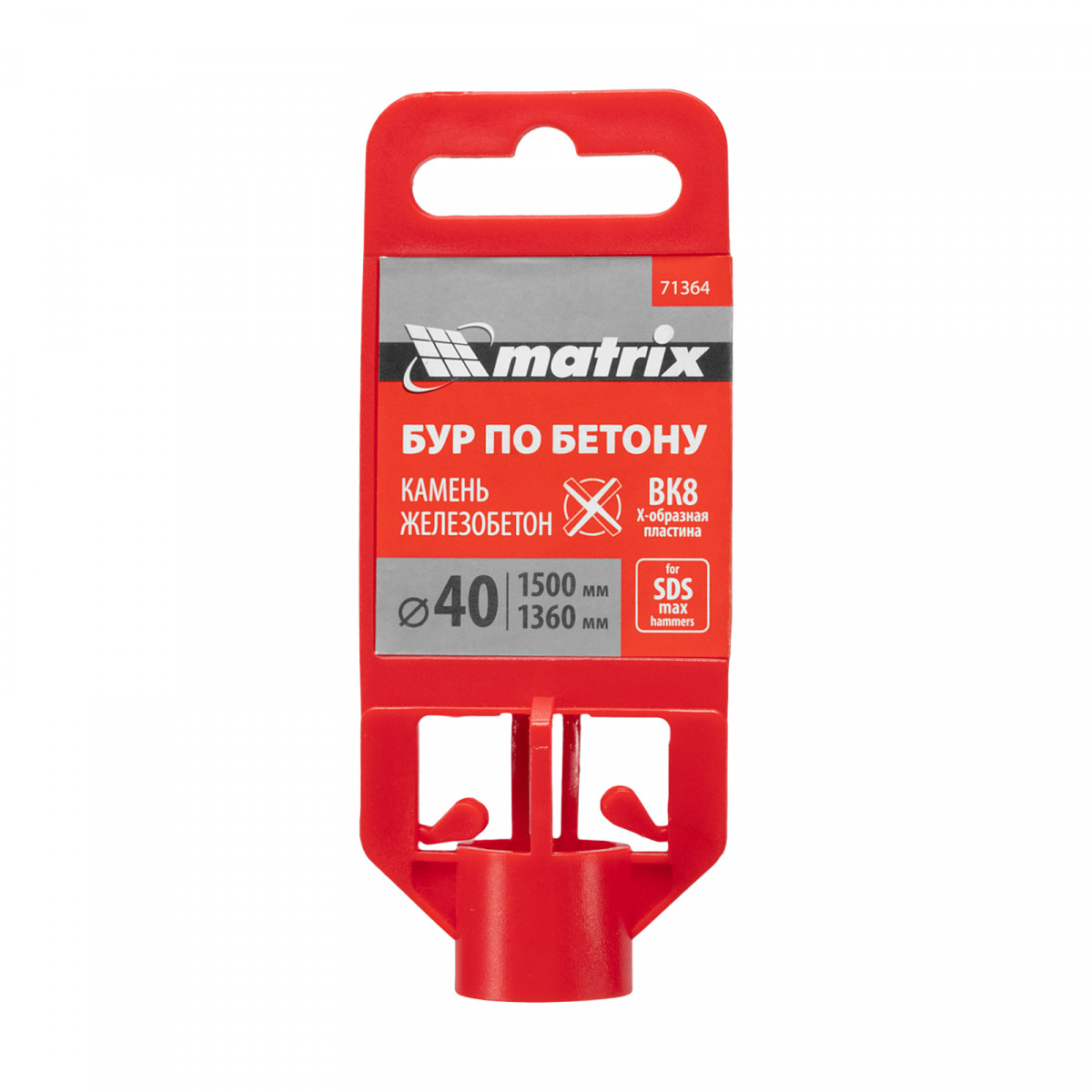 Бур по бетону Matrix 71364 длиной 1500 мм, с хвостовиком SDS MAX и крестовой пластиной, — оснастка для перфораторов высокой мощности, предназначенная для получения отверстий диаметром 40 мм в стенах, полах, перекрытиях. Крестовая пластина в сочетании с усиленной системой крепления SDS MAX позволяет успешно работать с камнем, кирпичом и бетоном, в том числе армированным. Бур используется во время проведения строительных работ, незаменим для прокладки коммуникаций: газо- и водопроводов, электросетей и т.д.