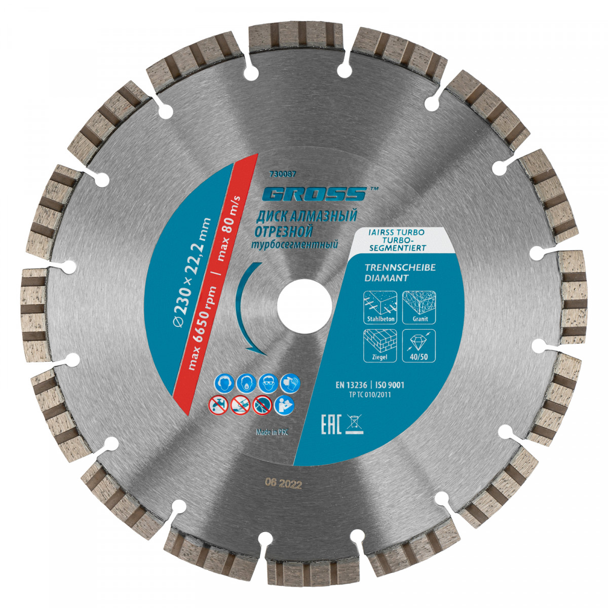 Диск алмазный, 230 х 22.2 мм, лазерная приварка турбо-сегментов, сухая резка Gross