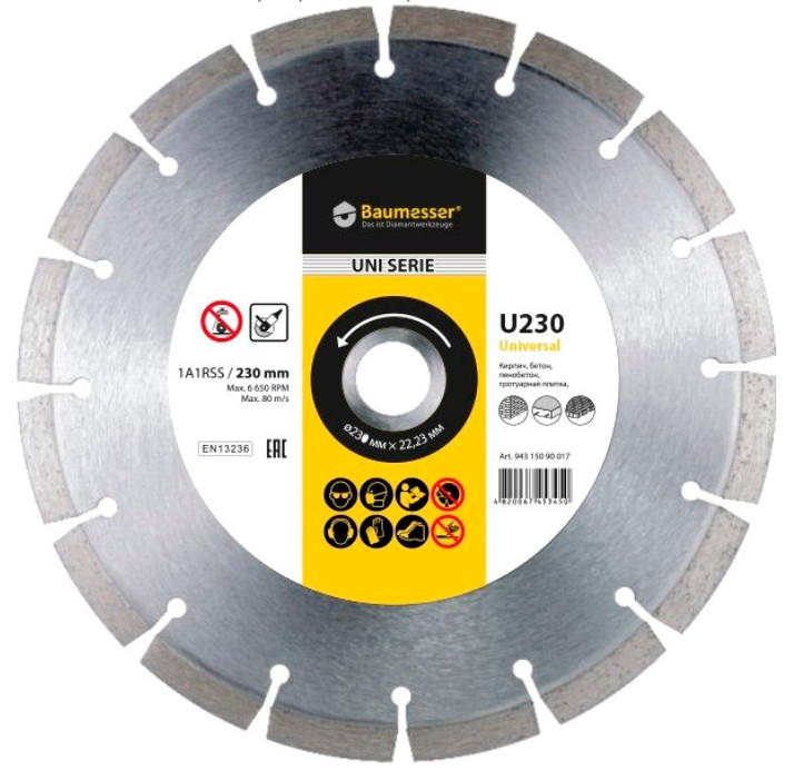 Диск отрезной алмазный Baumesser Universal 1A1RSS/C3-H подходит для распила бетона, гранита, кирпича, песчаника и тротуарной плитки. Диаметр круга равен 230 мм. Устанавливается на угловые шлифовальных машины с посадкой 22,23 мм. Сегментная кромка высотой 10 мм обеспечивает быстрый и качественный рез. Предназначен для работы без использования жидкости.