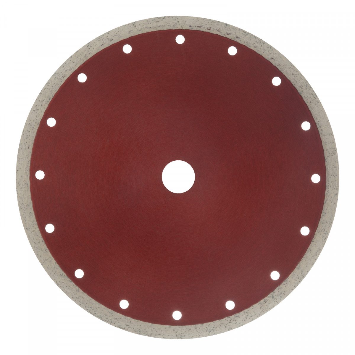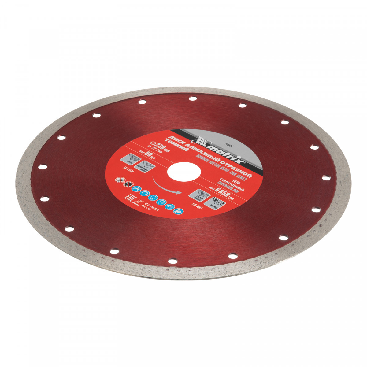 Отрезной сплошной алмазный диск Matrix ф230х22,2 мм 730837, тонкий, обеспечивает мокрое резание плотных материалов: керамогранита, керамической и кафельной плитки, мрамора, натурального и искусственного камня. Он устанавливается на УШМ или плиткорезы и используется с применением водяного охлаждения. Диск увеличивает производительность на 20% благодаря небольшой толщине 2,1 мм и снижению нагрузки на инструмент.