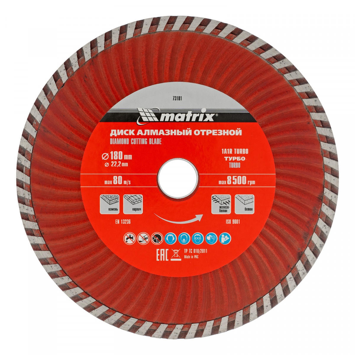 Отрезной алмазный диск Matrix Turbo 73181 диаметром 180 х 22,2 мм, предназначен для сухой резки. Используется в качестве сменной оснасткой для углошлифовальных машин (УШМ) во время ремонта и мелкого строительства, а также в быту. Позволяет работать по бетону, в том числе свежему и среднеармированному, камню и кирпичу.