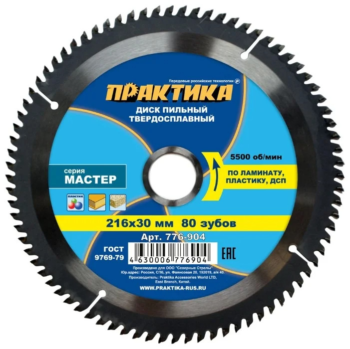 Диск пильный 216*30 мм 80 зубьев по ламинату, пластику, ДСП "Практика"