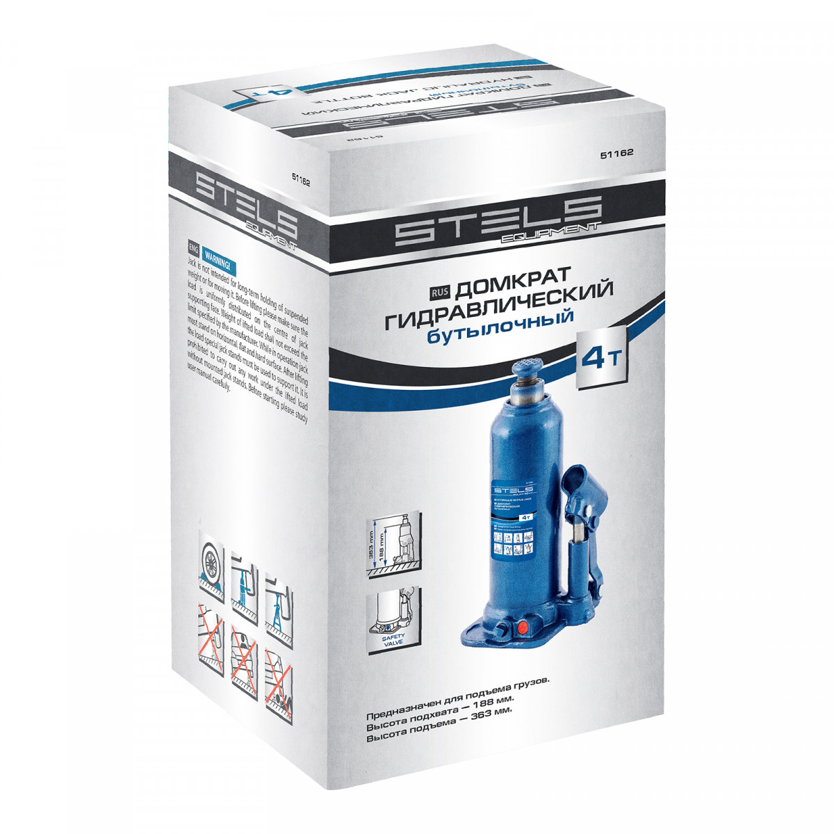 Гидравлический бутылочный домкрат Stels 51162 применяется для быстрого поднятия грузов весом до 4 т на высоту 188-363 мм. Оптимален для автомобилей с большим клиренсом. Домкрат будет полезен автолюбителям и профессионалам для ремонта транспортного средства.