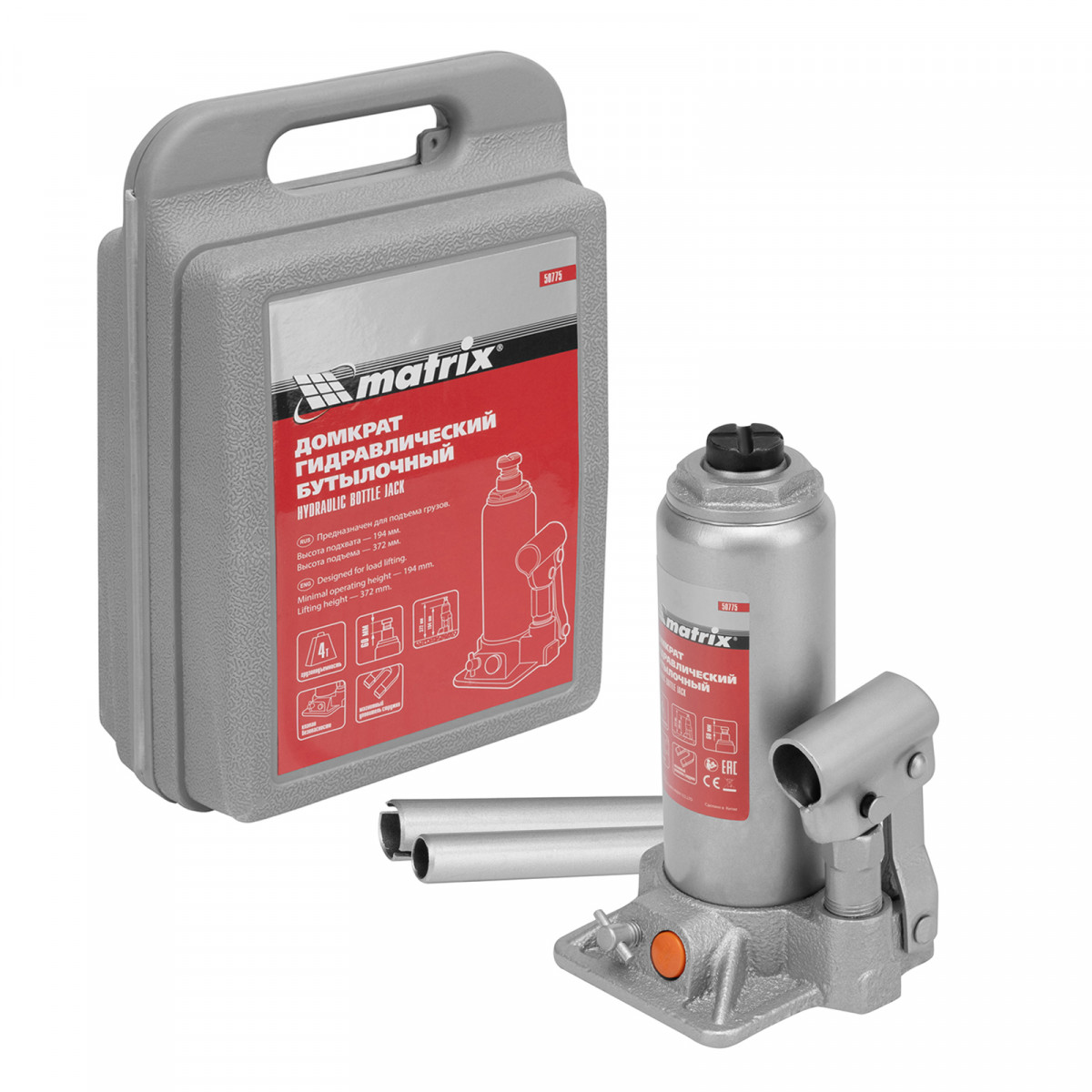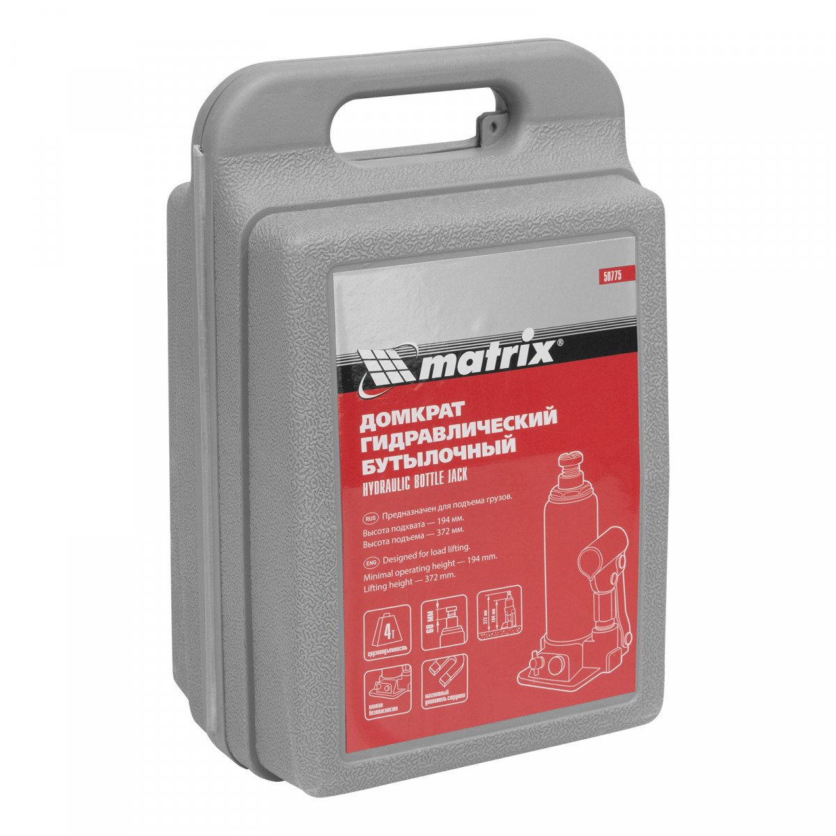 Домкрат гидравлический бутылочный, 4 т, h подъема 194-372 мм, в пластиковом кейсе Matrix