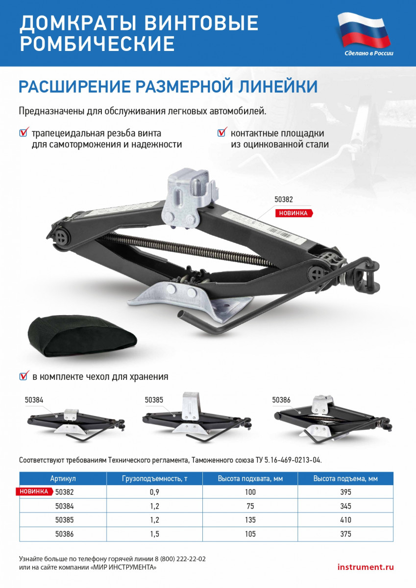 Универсальный винтовой ромбический домкрат 50382 соответствует ТУ 5.16-469-0213-04 и способен поднять груз массой 0,9 т на высоту от 100 до 395 мм. Предназначен для обслуживания малолитражных автомобилей. За счет небольшой высоты подхвата 100 мм домкрат является универсальным. Он приводится в действие при помощи простого и надежного винтового механизма. Будет полезен в гараже, пригодится также и в дороге.