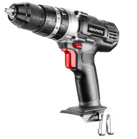 Двухскоростная ударная дрель-шуруповерт GRAPHITE, работающая с аккумуляторными батареями 18 В Li-Ion GRAPHITE Energy+. Электроника плавной регулировки оборотов, реверс, оснащен электрическим тормозом и автоматической блокировкой шпинделя, подсветка. Самозажимной патрон позволяет использовать оснастку диаметром 2-13 мм. Максимальная частота вращения шпинделя на первой скорости составляет 350 оборотов в минуту, а на второй скорости - 1250. Частота механического удара на первой скорости составляет 5250 ударов в минуту, а на второй скорости - 18750. Максимальный крутящий момент составляет 35 Нм (мягкое ввинчивание) / 55 Нм (твердое ввинчивание), момент можно регулировать благодаря 16-ступенчатой муфте с дополнительным быстрым переключателем режима работы для ввинчивания, сверления и сверления с ударом. Форма рукоятки и компактная конструкция обеспечивают удобную работу. Рукоятка покрыта антискользящим материалом. Планетарная передача изготовлена из высокосортной стали.