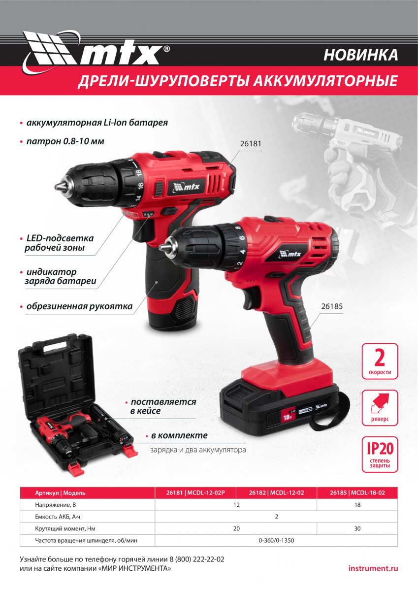 Аккумуляторная дрель-шуруповерт MTX MCDL-12-02P 26181 работает от аккумуляторной батареи Li-Ion 12 В емкостью 2 А·ч и развивает крутящий момент до 20 Н·м. Предназначена для закручивания и откручивания резьбового крепежа, а также сверления отверстий в металле (диаметром до 6 мм), древесине (до 20 мм), пластмассе и других материалах. В комплекте с инструментом идут сразу два аккумулятора, что позволит избежать перерывов в работе.