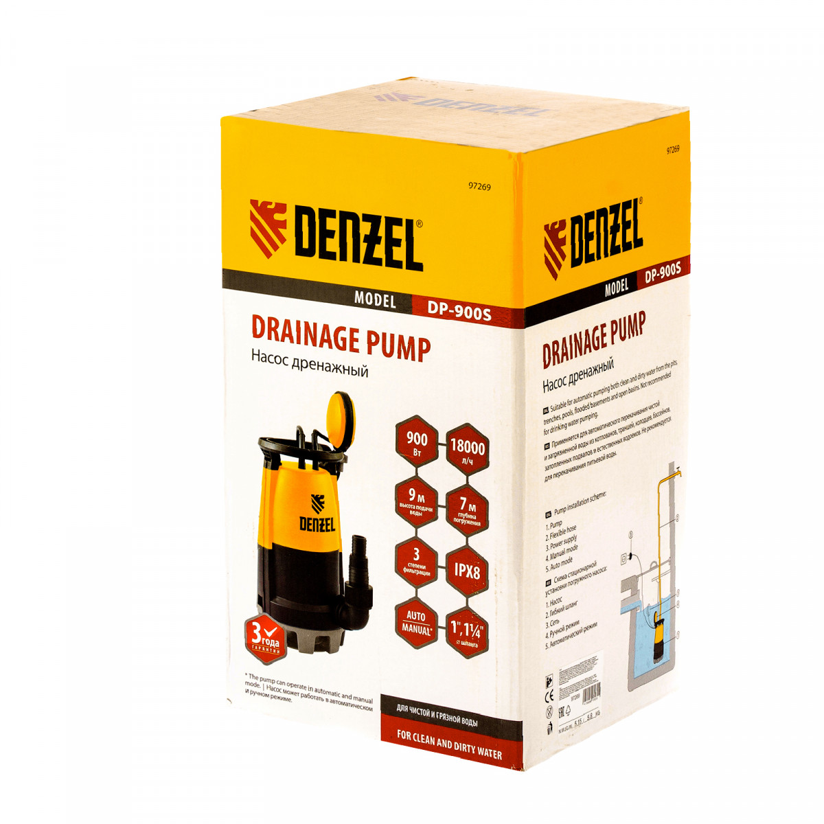 Дренажный насос для чистой и грязной воды DP900S, 900 Вт, напор 9 м, 18000 л/ч Denzel