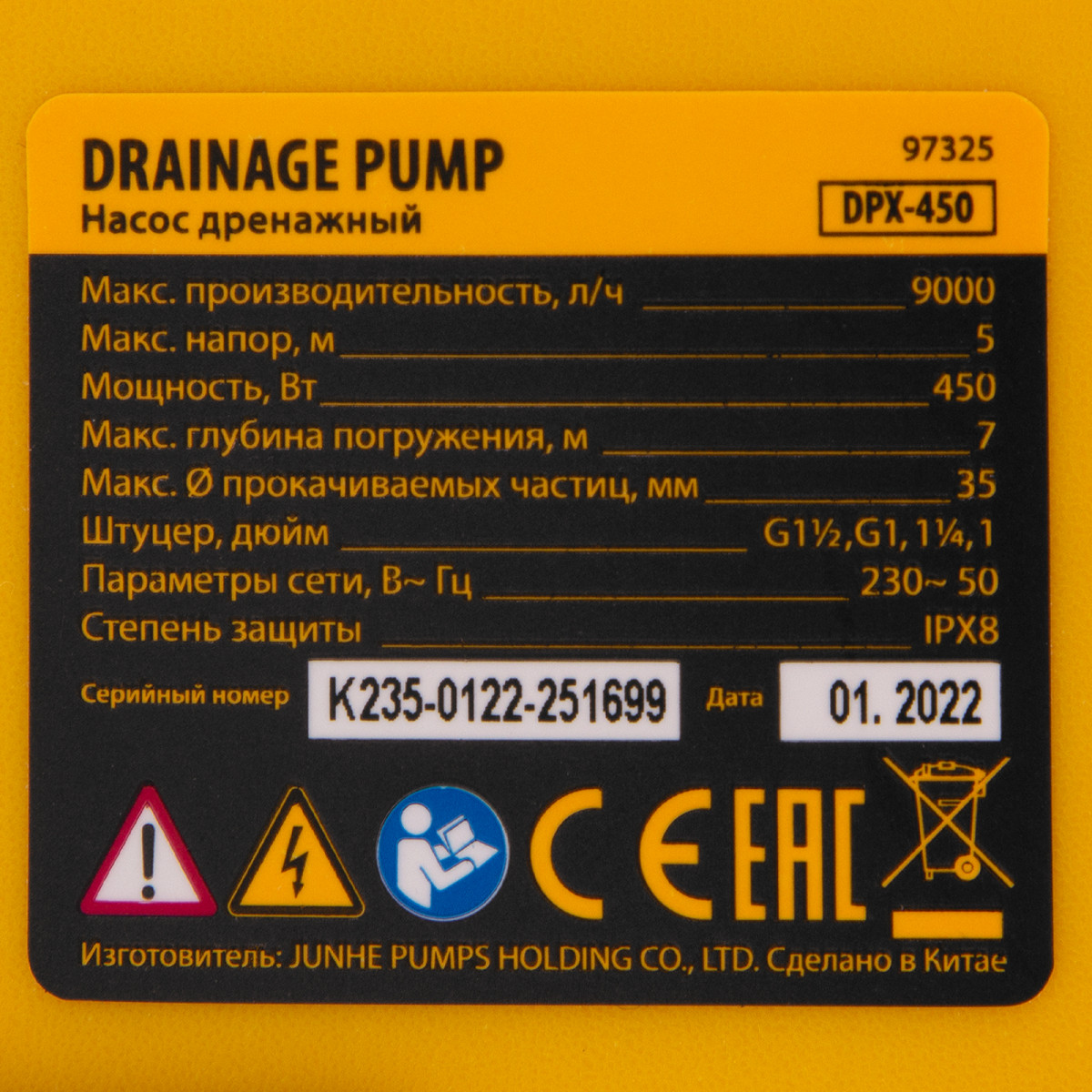Дренажный насос DPХ450, 450 Вт, подъем 5 м, 9000 л/ч Denzel