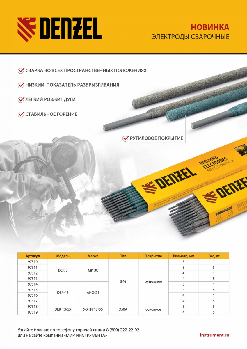 Электроды DER-46, диам. 3 мм, 5 кг, рутиловое покрытие Denzel