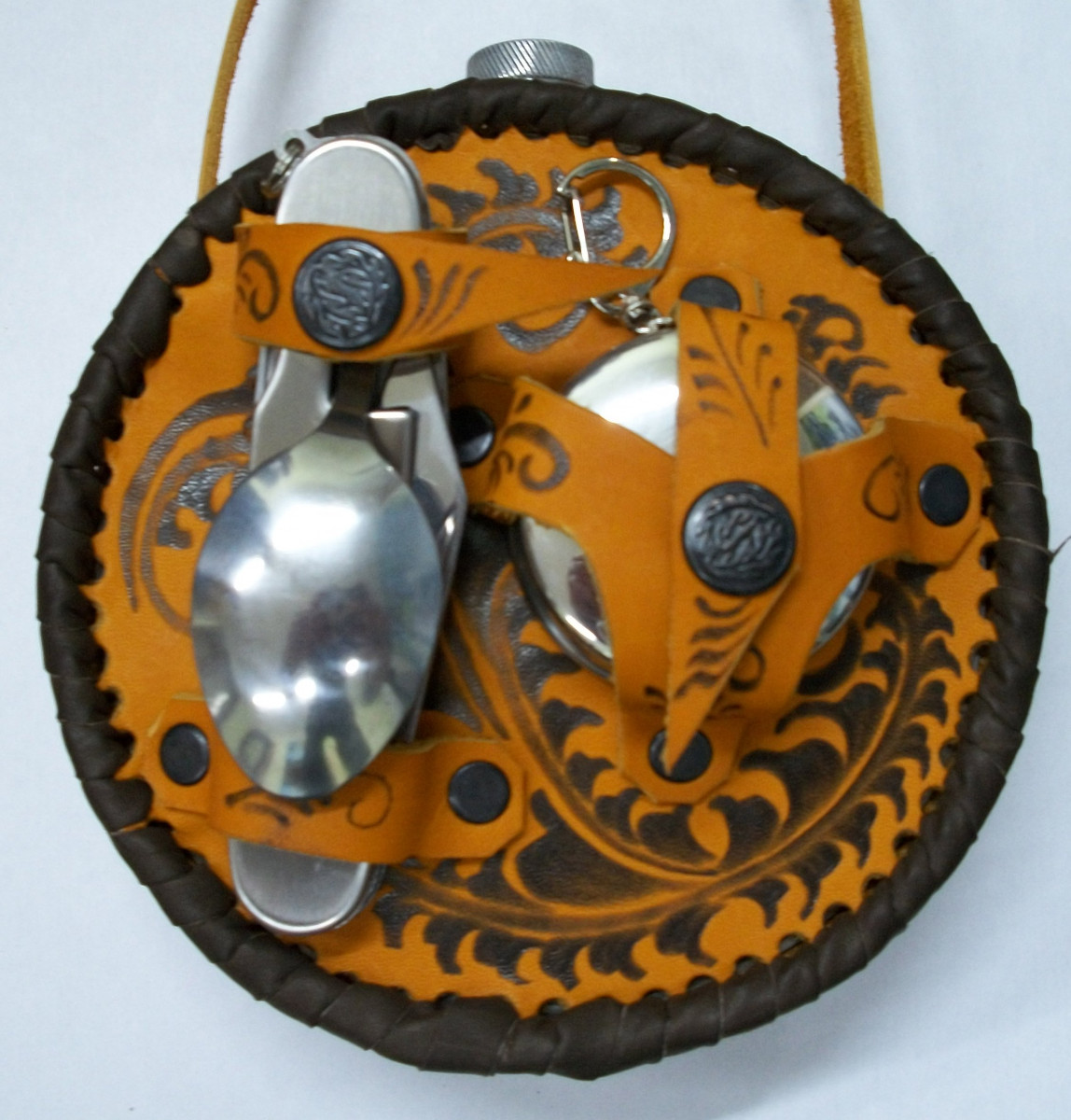 Фляга круглая 0,5 л (обшитая кожей с рисунком), в комплекте нож комбинированный и складной стакан