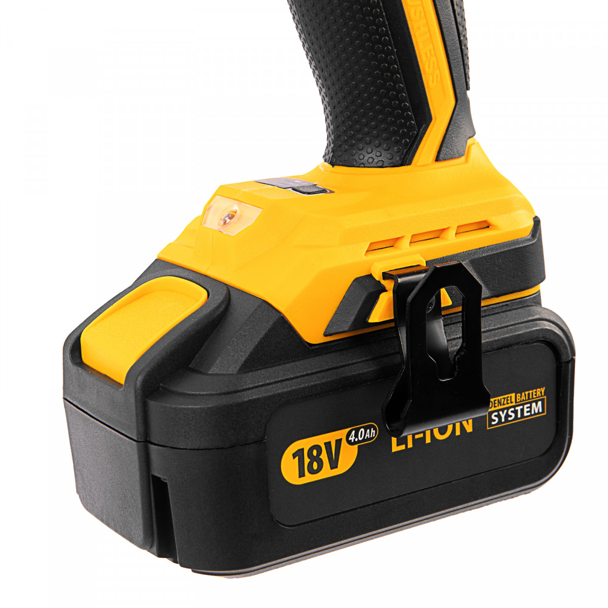• Универсальность — аккумулятор 4 А/ч Li-ion совместим с любым инструментом 18V Denzel battery system серии IB.