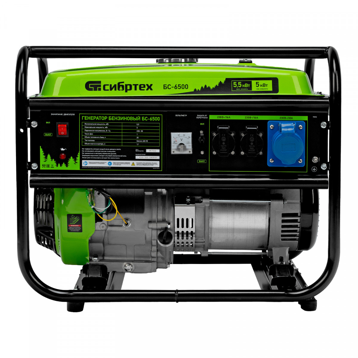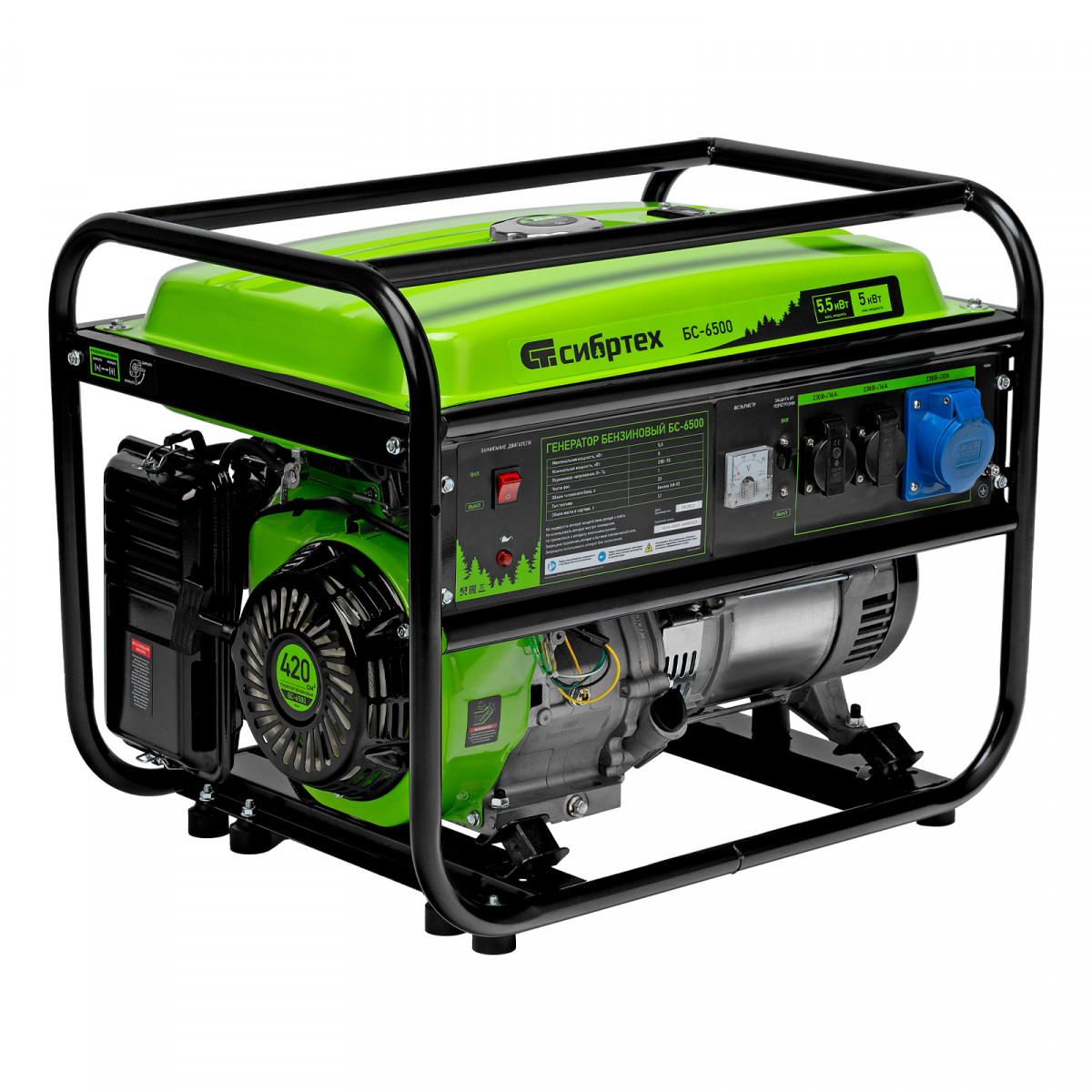 Бензиновый генератор Сибртех БС-6500 94546 на 230 В, с 4-тактным двигателем, баком на 25 л и ручным стартером, выдает 5,5 кВт и подходит для создания целой электросети в загородном доме, магазине, мастерской или на строительной площадке. К нему можно одновременно подключить 5 ламп накаливания, холодильник, телевизор. Для подключения приборов предусмотрено 3 розетки. Одна из них силовая на 32А, что позволяет запитать мощное оборудование, например, электрическую плиту.