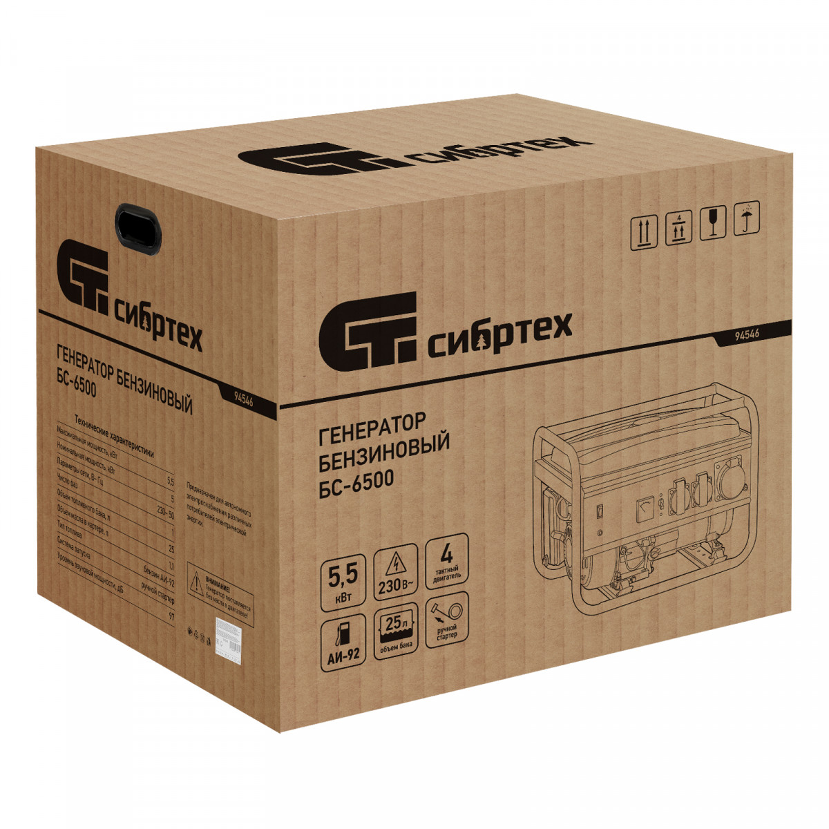 Генератор бензиновый БС-6500, 5.5 кВт, 230В, четырехтактный, 25 л, ручной стартер Сибртех
