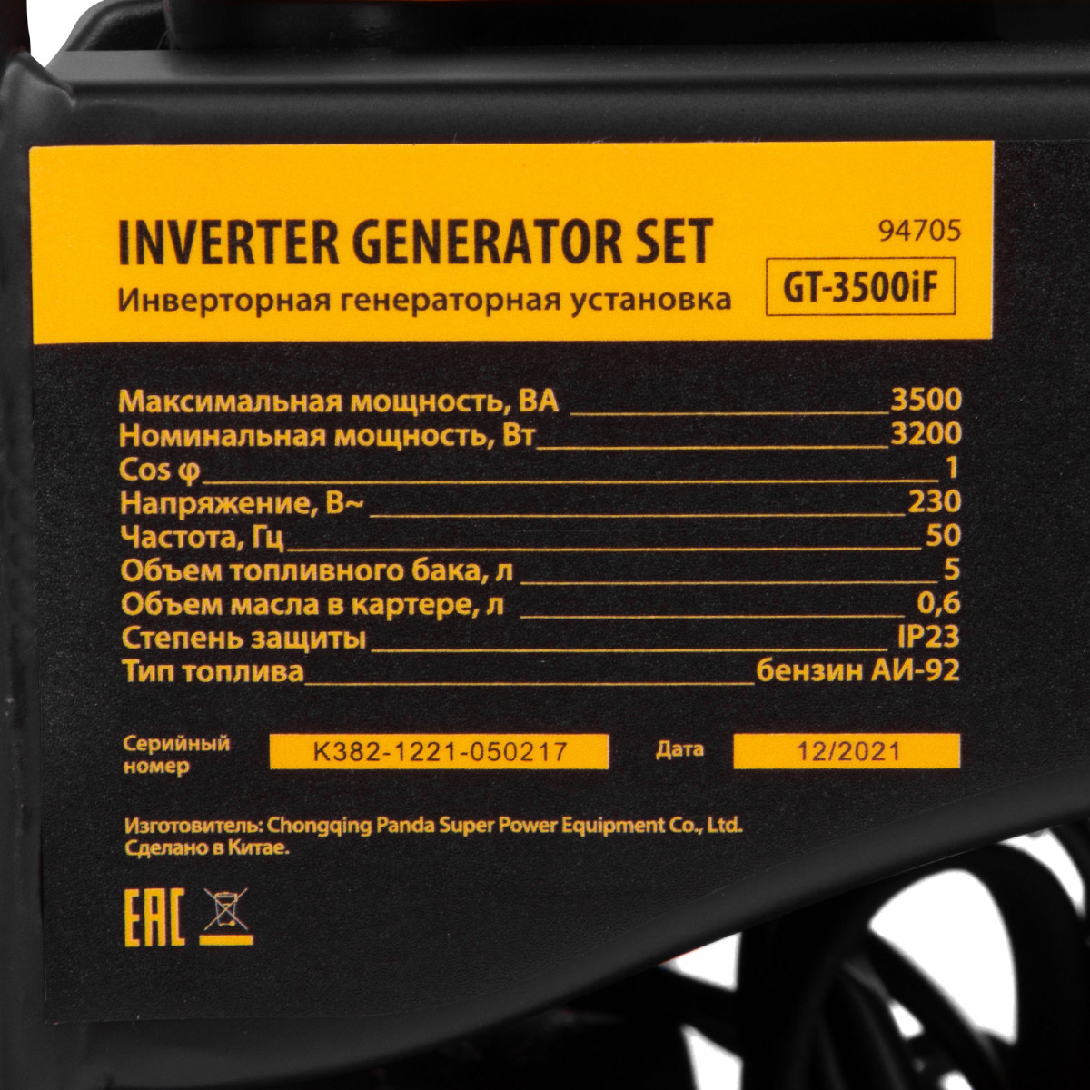 Генератор инверторный GT-3500iF, 3.5 кВт, 230 В, бак 5 л, открытый корпус, ручной старт Denzel