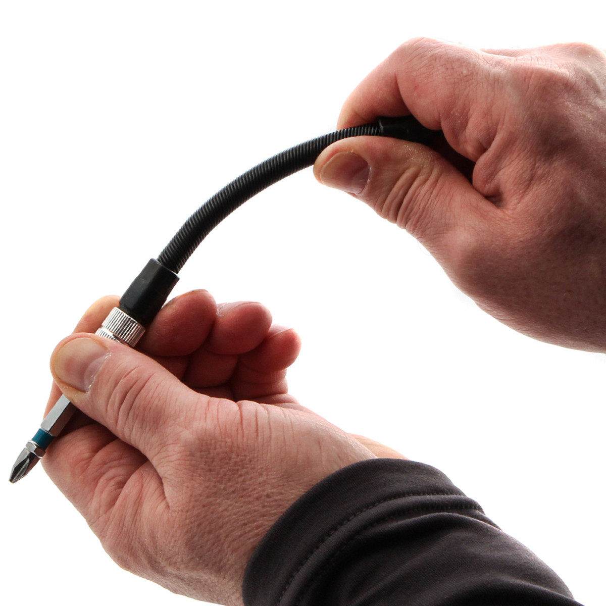 • Гибкий стержень — переходник позволяет получить доступ к участкам, расположенным под углом к оси вращения патрона шуруповерта.