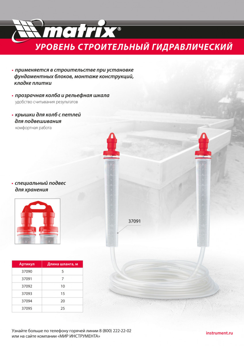 Гидроуровень Matrix 37095 с удлиненными колбами и рельефной градуировкой предназначен для выравнивания объектов на расстоянии до 25 м. Используется при проведении ремонтно-строительных работ: изготовлении опалубки, установке фундамента, кладке плитки. Особо светлые колбы с рельефной градуировкой облегчают считывание результатов измерения.