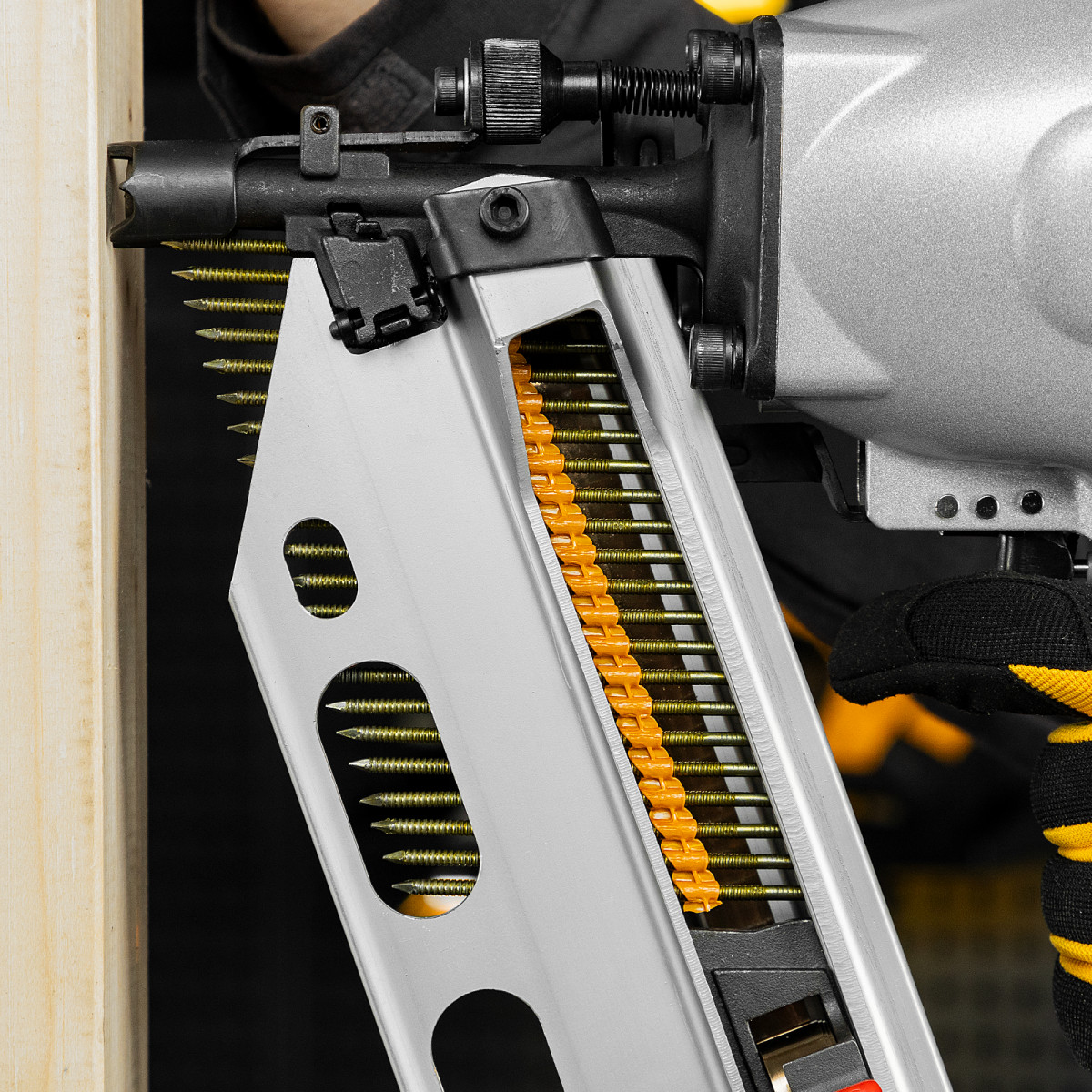Гвозди Denzel 57700 типа SN21, длиной 90 мм и диаметром 3,05 мм, с крашеной поверхностью, 2000 шт. в упаковке, — расходники для пневматического нейлера. Используются для скрепления различных материалов, будут полезны во время сборочных и отделочных работ.