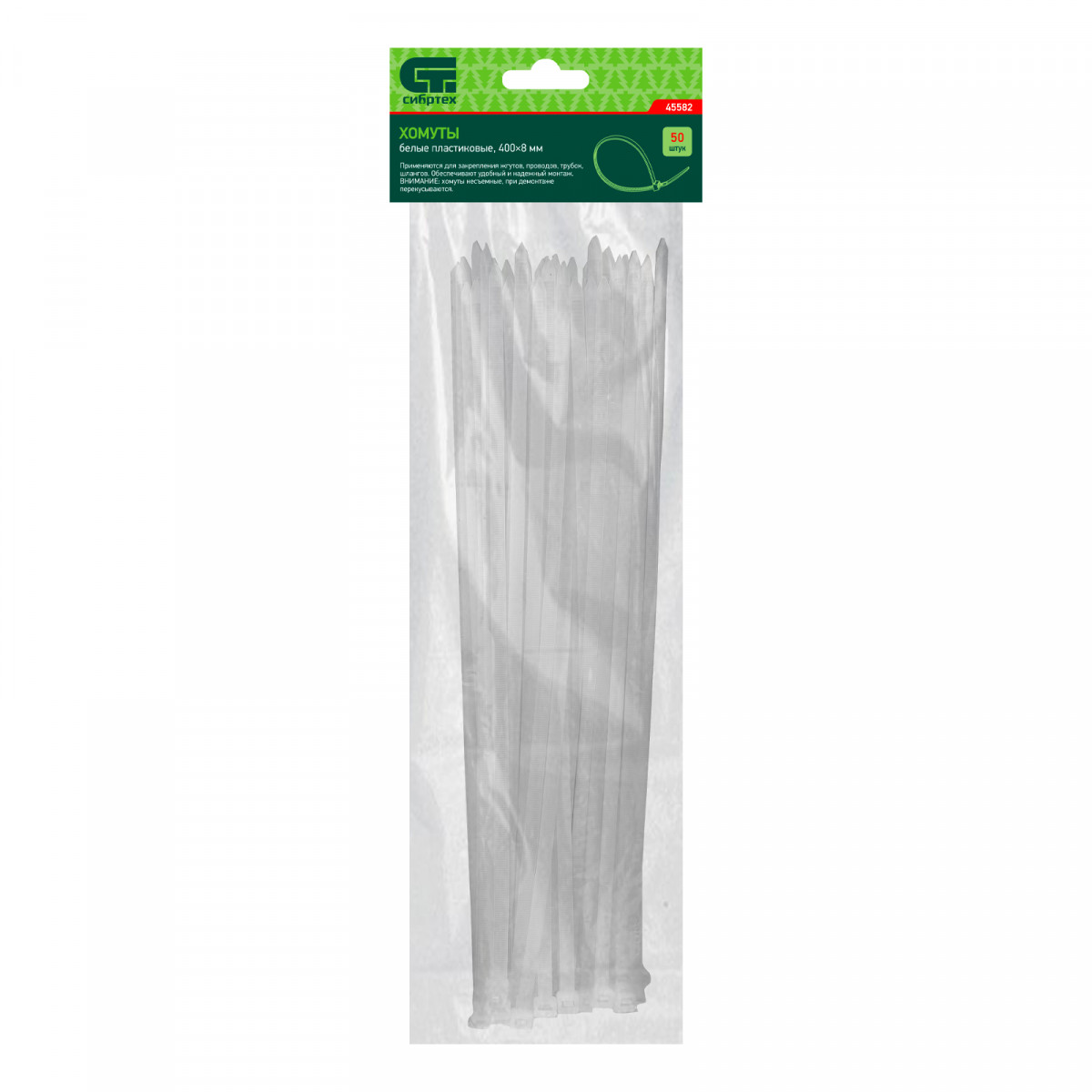 Белые пластиковые хомуты Сибртех 45582, 400 х 8 мм, 50 шт. в упаковке, используются для стяжки кабелей, закрепления трубок, шлангов, рекламных конструкций, а также для упаковки различных предметов. Пригодятся во время прокладки электрических и локальных вычислительных сетей, ремонта компьютерной техники, оформлении торговых стендов, комплектовании товара, будут также полезны дома, на даче и в гараже.