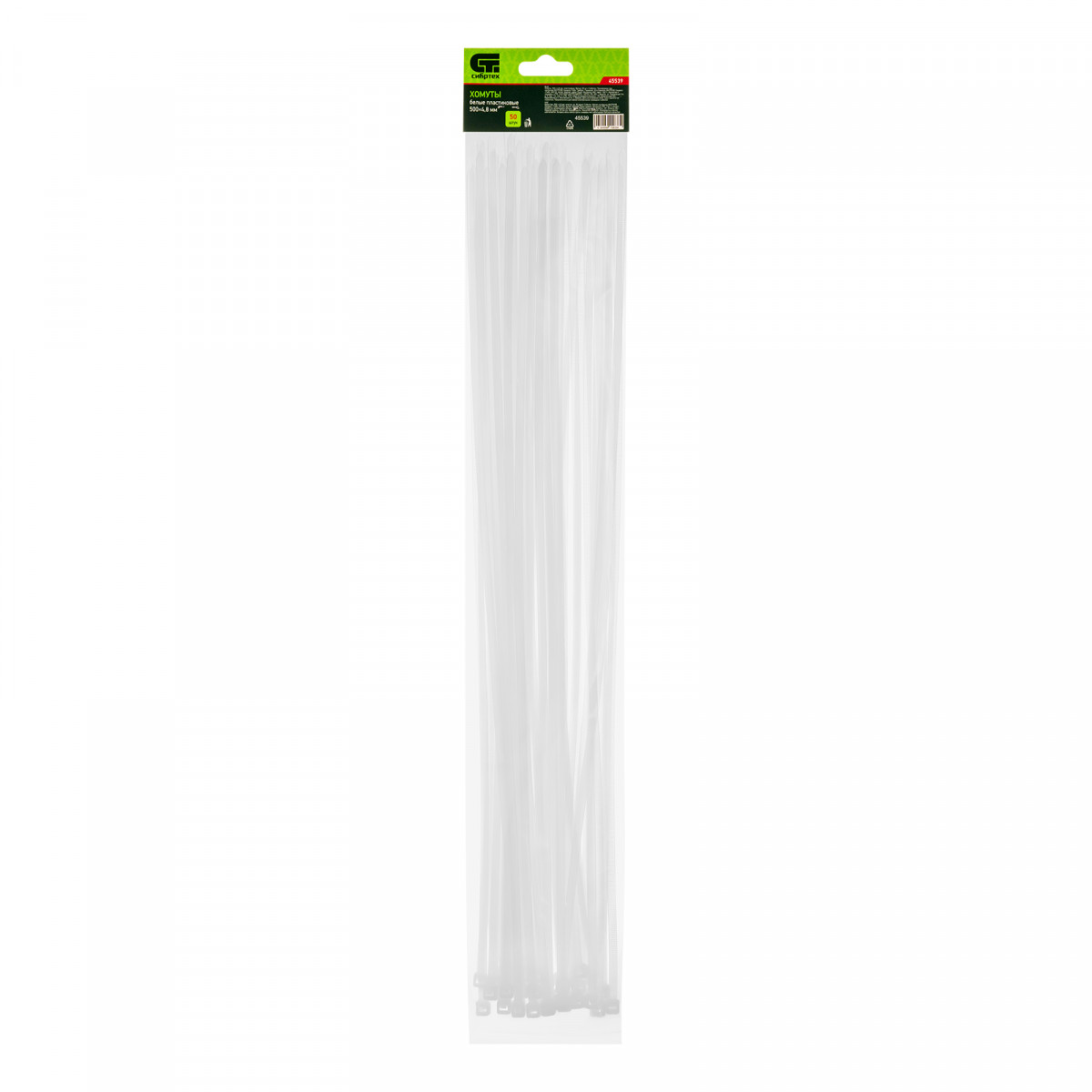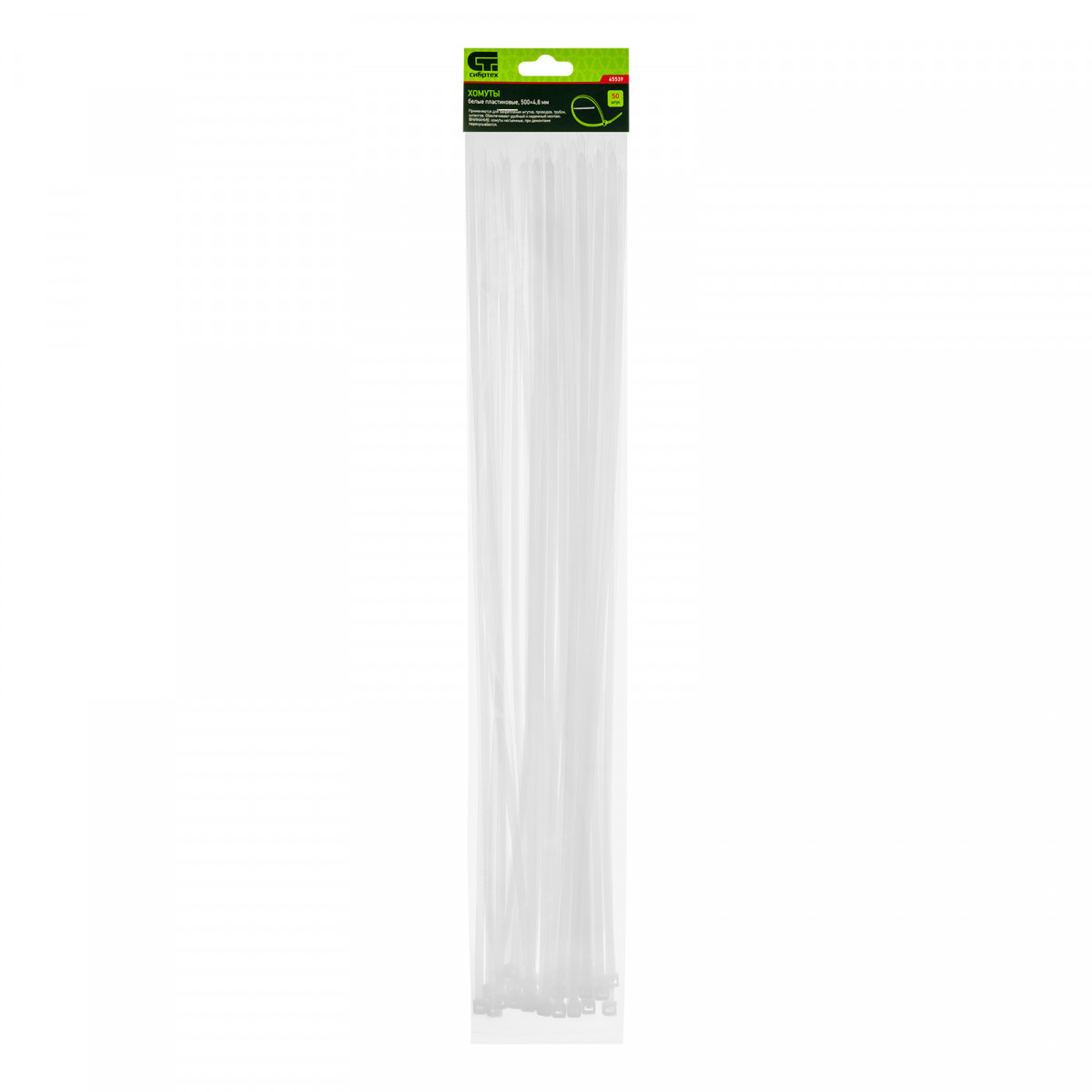 Белые пластиковые хомуты Сибртех 45539, 500 х 4,8 мм, 50 шт. в упаковке, используются для стяжки кабелей, закрепления трубок, шлангов, рекламных конструкций, а также для упаковки различных предметов. Пригодятся во время прокладки электрических и локальных вычислительных сетей, ремонта компьютерной техники, оформлении торговых стендов, комплектовании товара, будут также полезны дома, на даче и в гараже.