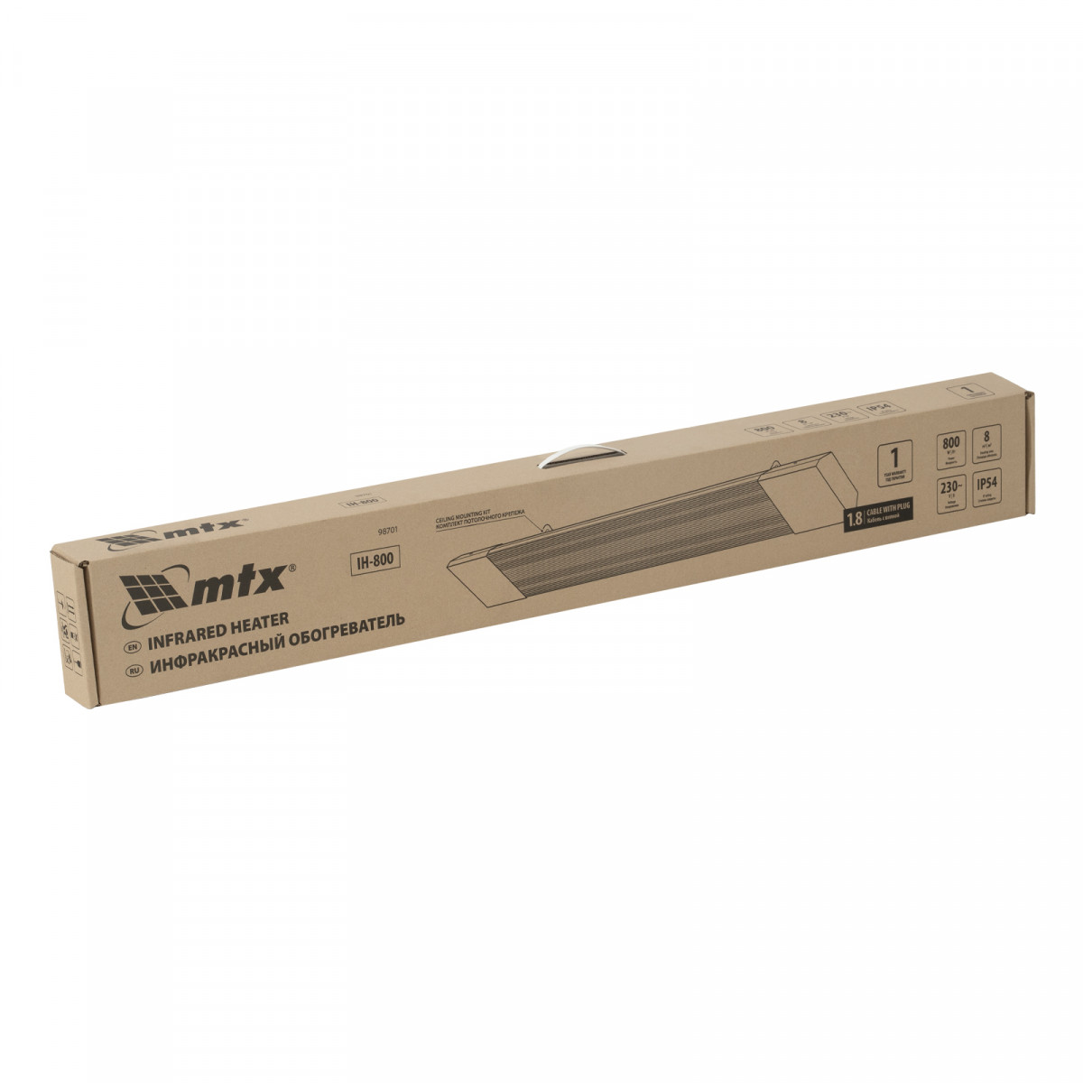Инфракрасный обогреватель MTX IH-800 98701 подключается к сети 230 В, потребляет мощность до 800 Вт, защищен по стандарту IP54 и оснащен кабелем длиной 1,8 м с вилкой. Предназначен для обогрева помещений, благодаря высокой степени защиты IP54 не боится влаги, поэтому может быть установлен на улице под открытым небом, на открытых верандах, в беседках, курятниках, теплицах и подвальных помещениях, часто используется для сушки деревянных поверхностей. Служит основным источником тепла на площади до 8 м² и дополнительным — в помещениях до 16 м². Произведен в России.