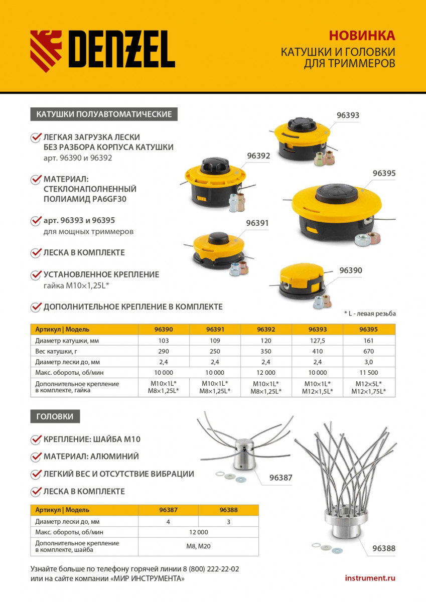 Полуавтоматическая триммерная катушка Denzel 96390 с легкой заправкой лески крепится на вал триммера при помощи гайки М10 с левой резьбой и шагом 1,25 мм, дополнительно комплектуется гайками М8 и М10 с шагом 1,25 и 1,0 мм соответственно. Заправляется леской диаметром до 2,7 мм, устанавливается на вал бензо- или электротриммера и используется для скашивания газонной травы, а также для удаления сорняков.