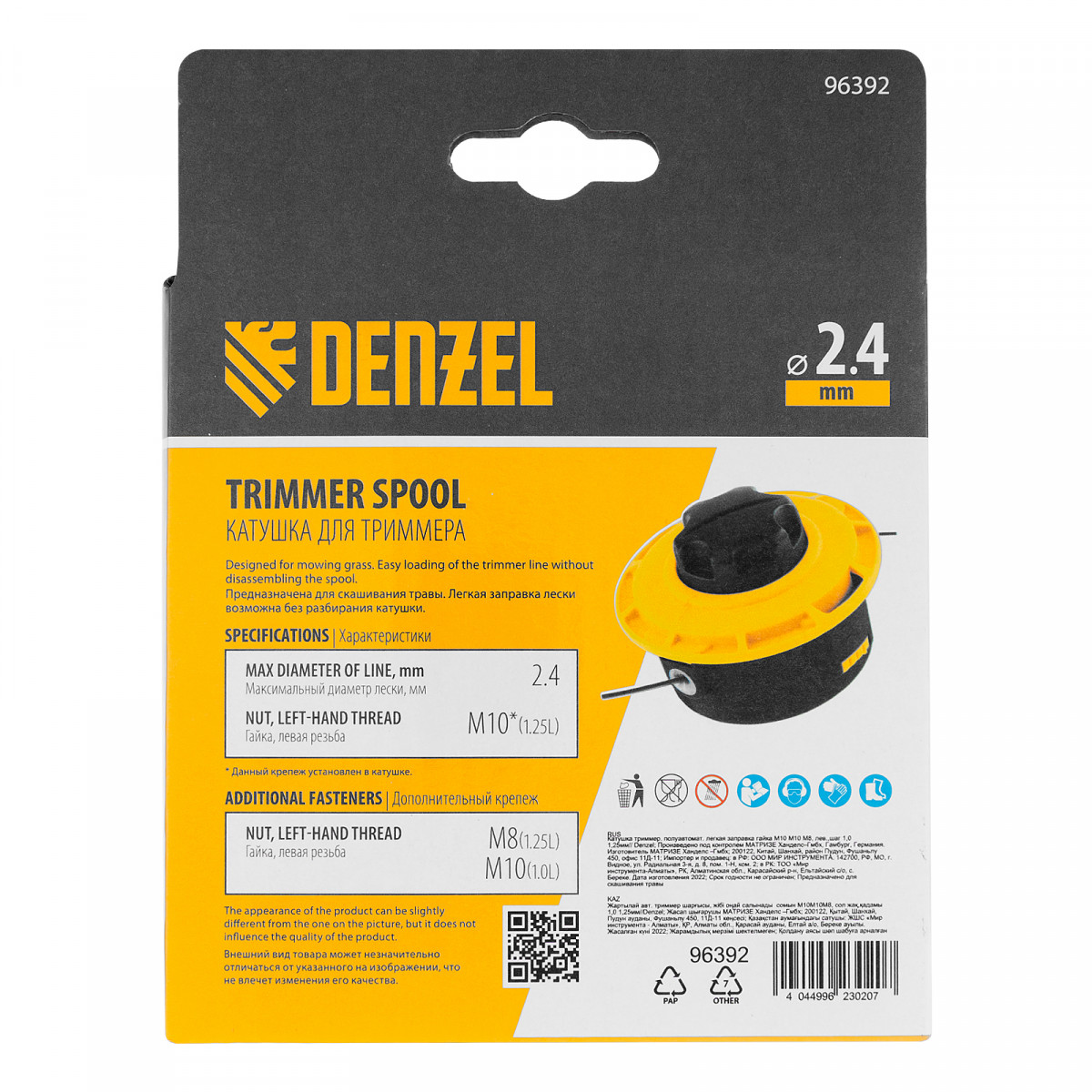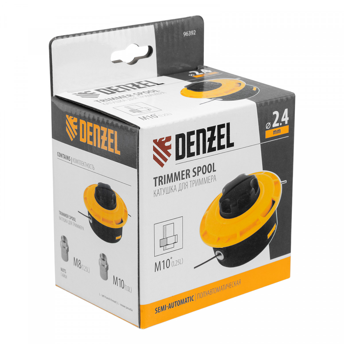 Полуавтоматическая триммерная катушка Denzel 96392 с легкой заправкой лески крепится на вал триммера при помощи гайки М10 с левой резьбой и шагом 1,25 мм, дополнительно комплектуется гайками М8 и М10 с шагом 1,25 и 1,0 мм. Заправляется леской диаметром до 2,7 мм, устанавливается на вал бензо- или электротриммера и используется для скашивания газонной травы, а также для удаления сорняков.