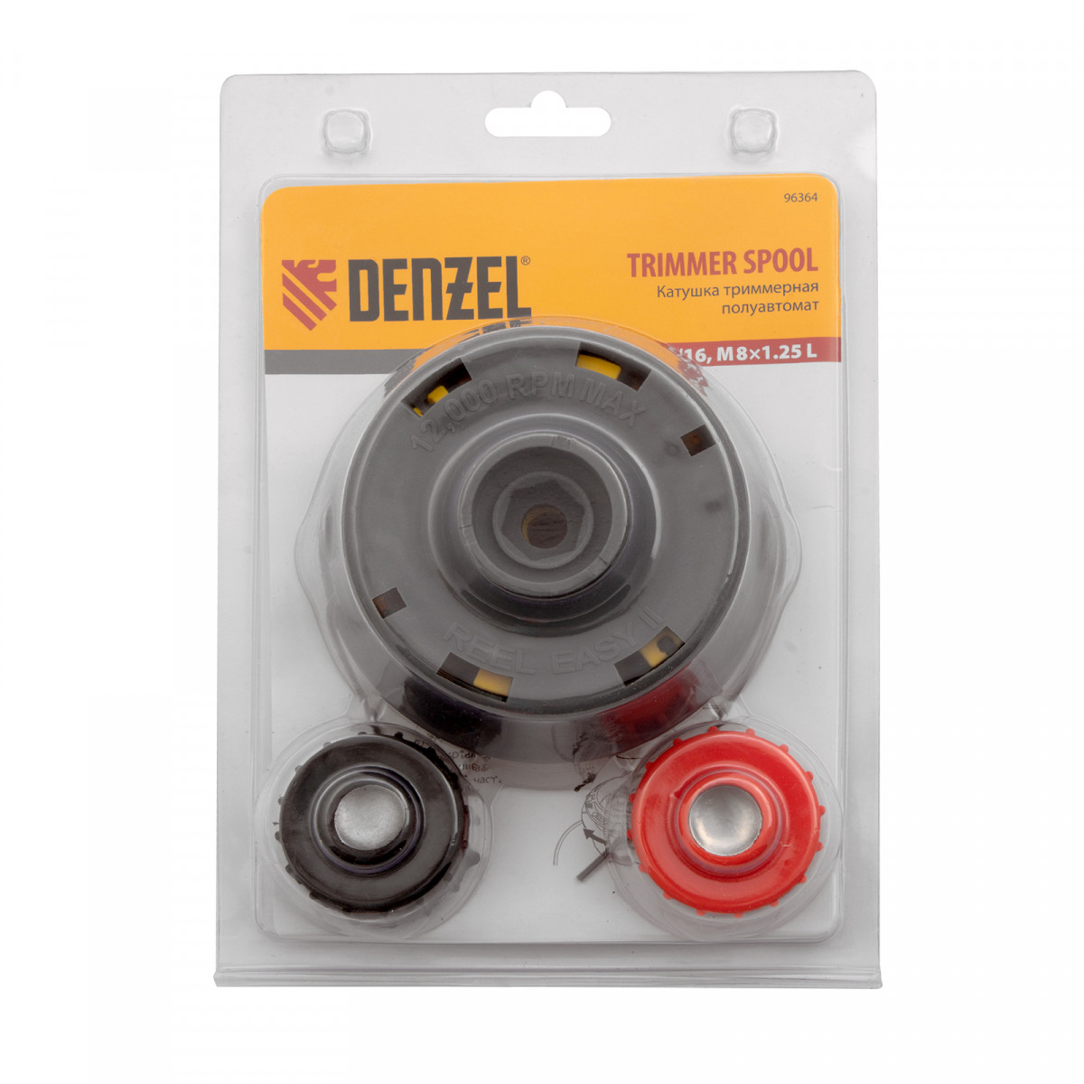 Полуавтоматическая триммерная катушка Denzel 96364 с возможностью быстрой заправки, с посадкой под шестигранник HEX x 15/6, с болтом 5/16 и М8 с левой резьбой, предназначена для установки на бензиновую или электрическую косу. Совместима с режущей леской диаметром до 2 мм и успешно справляется с молодой травой на садовом участке.