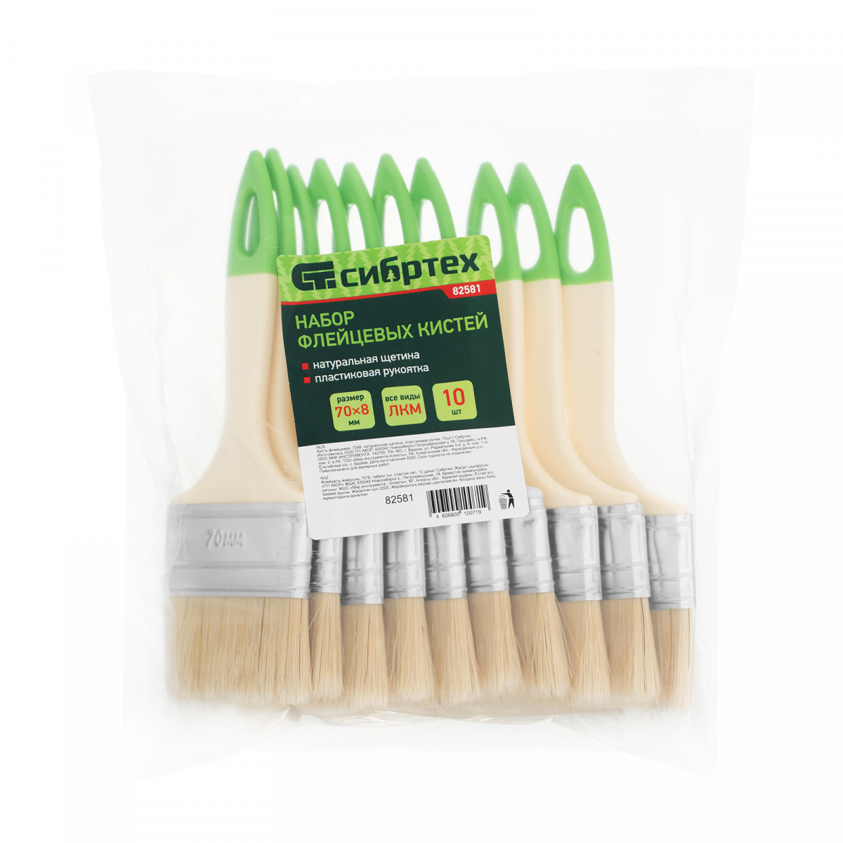 Кисть флейцевая, 70*8, натуральная щетина, пластиковая ручка, 10шт Сибртех