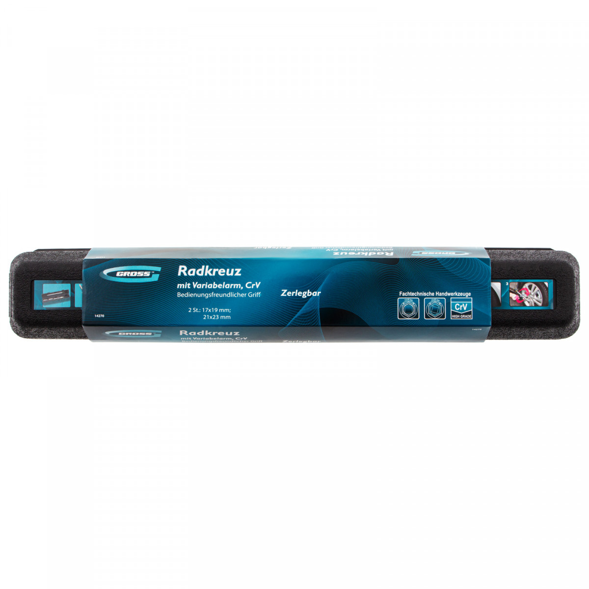 Складной баллонный ключ-крест с изменяющимся рычагом Gross 14270 из стали CrV, хромированный, с головками на 17, 19, 21, 23 мм, предназначен для откручивания и закручивания колесных крепежей. Поставляется с двумя двусторонними торцевыми головками под 4 размера резьбовых соединений. Запатентованный механизм фиксации телескопической рукоятки позволяет изменять длину рычага и оптимально дозировать величину крутящего момента. Инструмент рекомендован для профессионального использования, также может применяться для самостоятельного обслуживания автомобиля.