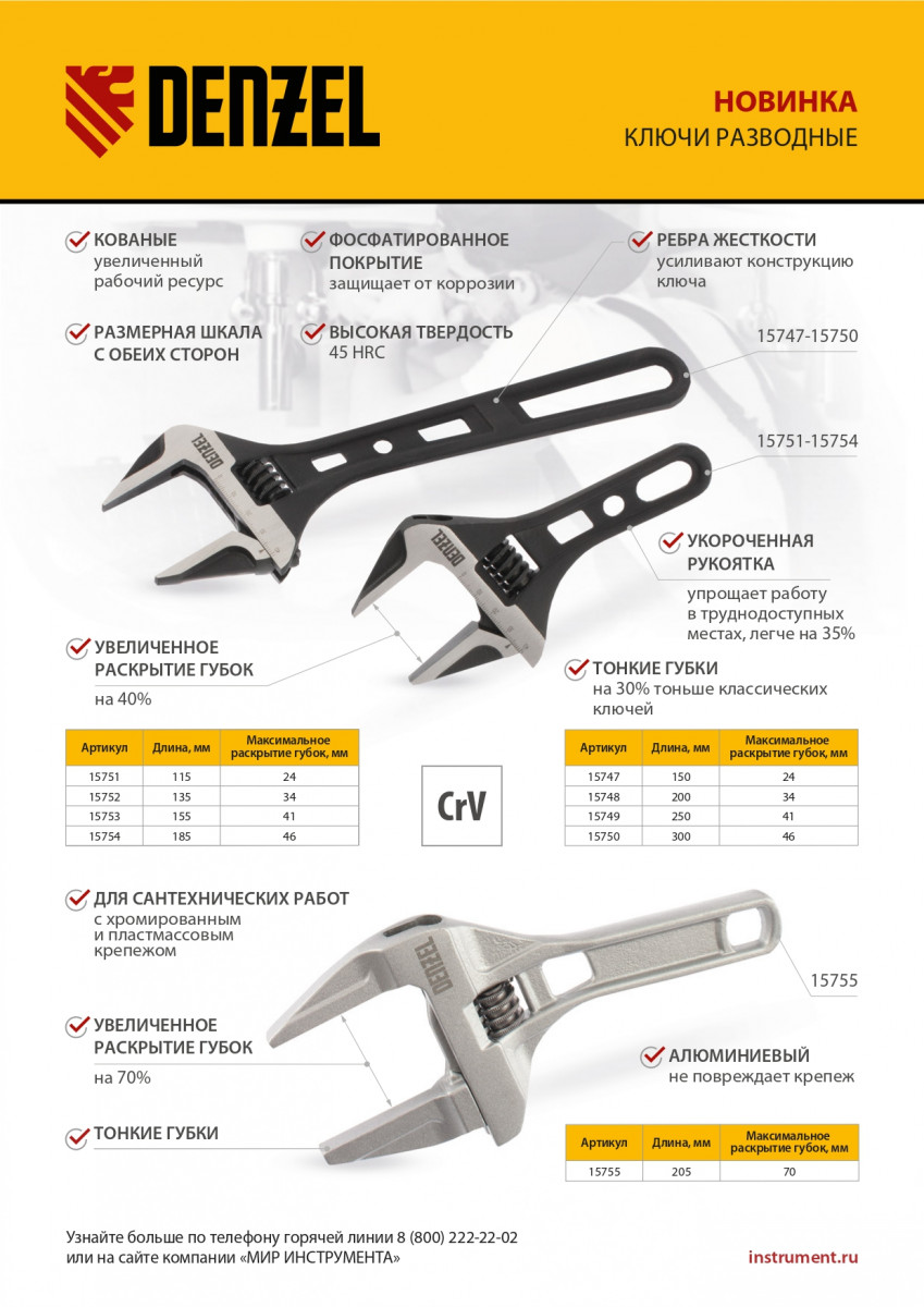 Ключ разводной кованый Denzel 15753 длиной 155 мм, из стали CrV, с укороченной рукояткой и увеличенным раскрытием губок, используется для монтажа и демонтажа крепежных элементов диаметром до 41 мм. Благодаря тонким губкам и укороченной рукоятке удобен для работы в труднодоступных местах. Имеет широкую область применения: сантехнические работы, мелкий бытовой ремонт, полупрофессиональная сфера и т. д.