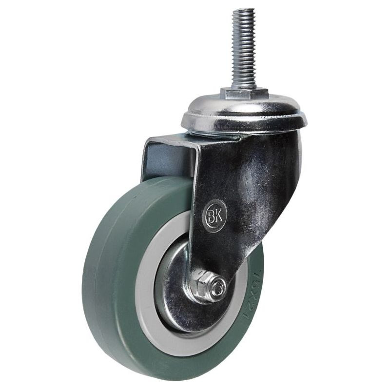Колесо аппаратное SCtg93 со штырем относится к легкой серии колес. Ободная часть аппаратной колесной опоры со штырем SCtg93 изготовляется из серого полипропилена с двумя боковыми пыльниками, защищающими осевой механизм от повреждения посторонними веществами и пылью.Главной особенностью аппаратных колесных опор со штырем SCtg93 является термоэластичный контактный слой, не наделяющий следами любые поверхности пола. Благодаря отмеченным особенностям шинки, аппаратные колесные опоры со штырем SCtg93 используются для медицинских кроватей и других транспортных конструкций в помещениях с маркими полами, для аппаратуры, бытовой и офисной мебели, для медицинской техники и оборудования, металлической мебели, стеллажей, на тележки-"шпильки"для пищевых производств, для гостиничного оборудования и химчисток,а также для торгового оборудования и торговой мебели.В основе поворотного механизма аппаратной колесной опоры SCtg93 находится двухрядный шариковый подшипник. В оси колесной опоры аппаратного типа с креплением со штырем применена втулка скольжения. Аппаратные колесные опоры со штырем SCtg93 обладают типовым креплением: отвести предназначенной для вхождения крепежного болта.Термические условия эксплуатации аппаратных колесных опор находятся в рамках от - 20°С до +50°С.