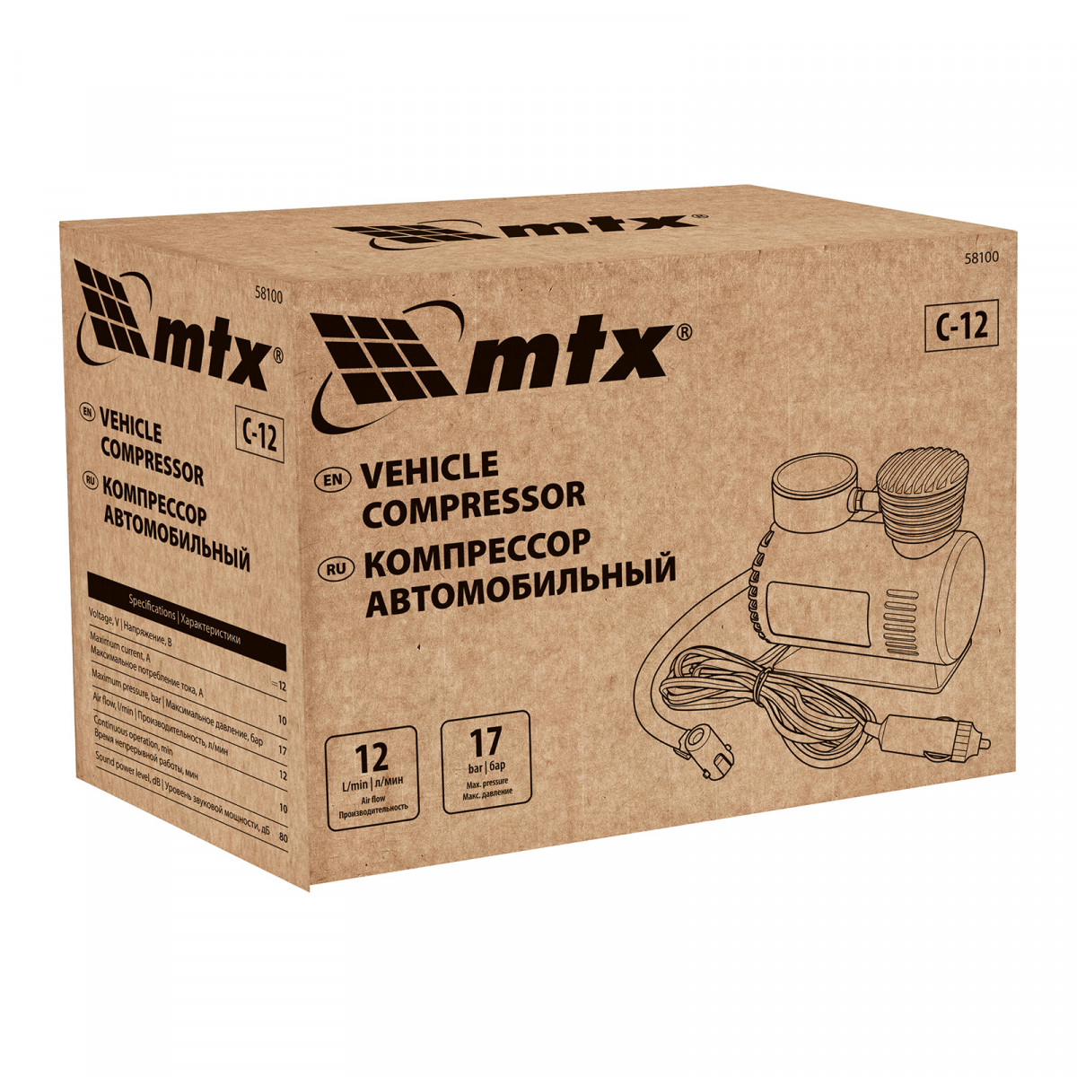 Автомобильный компрессор MTX C-12 58100 производительностью 12 л/мин обеспечивает давление до 17 атмосфер и питается от прикуривателя 12 В. Используется для накачки шин, а также мячей, матрасов, лодок и другого инвентаря. Компрессор поршневого типа способен накачать колесо R16 за 10 минут. Устройство пригодится в поездке, на даче, во время отдыха на природе.