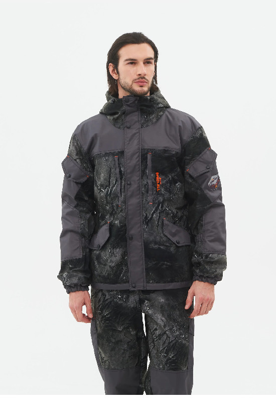 Внизу с двумя косыми прорезными карманами на клапане, объемные карманы на рукавах. Брюки анатомического кроя с подкладкой из флиса, низ на резинке, застежка гульфик на кнопках, пояс на широкой прошитой резинке, на поясе шлёвки для ремня. К поясу крепятся съёмные подтяжки-кобура на пуговицах, спереди два боковых прорезных кармана, сзади два накладных кармана на липучках, на уровне колена два боковых накладных кармана на кнопках, по низу брюк на резинке.