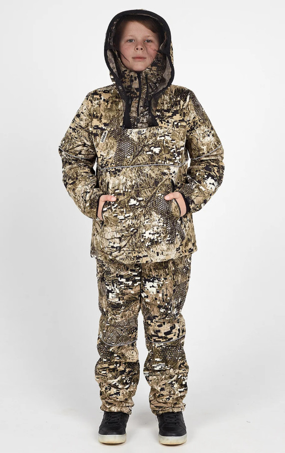 Костюм Антиклещ с ловушками (противоэнцефалитный), выполнен из твила камуфляжной расцветки FL 1120-1. Куртка свободного кроя, одевается через голову. На куртке два прорезных кармана и один нагрудный карман под сетку с застежкой на пуговицу. Низ куртки утягивается резинкой с фиксатором. Внутри куртки хлопковая подкладка в виде юбки, которая предназначена для заправки в брюки. На рукавах куртки имеются трикотажные манжеты. На капюшоне защитная сетка на лицо, которую можно отстегнуть и убрать в специальный карман. Капюшон можно регулировать с помощью утяжки на липучке. Брюки на резинке, утягиваются шнуром, имеют два прорезных кармана на бедрах, и два накладных с клапанами на липучках. Низ брюк со специальными манжетами и утяжкой.На куртке и брюках имеются специальные манжеты (подвороты) - ловушки от клещей, с яркой вставкой на внутренней стороне.